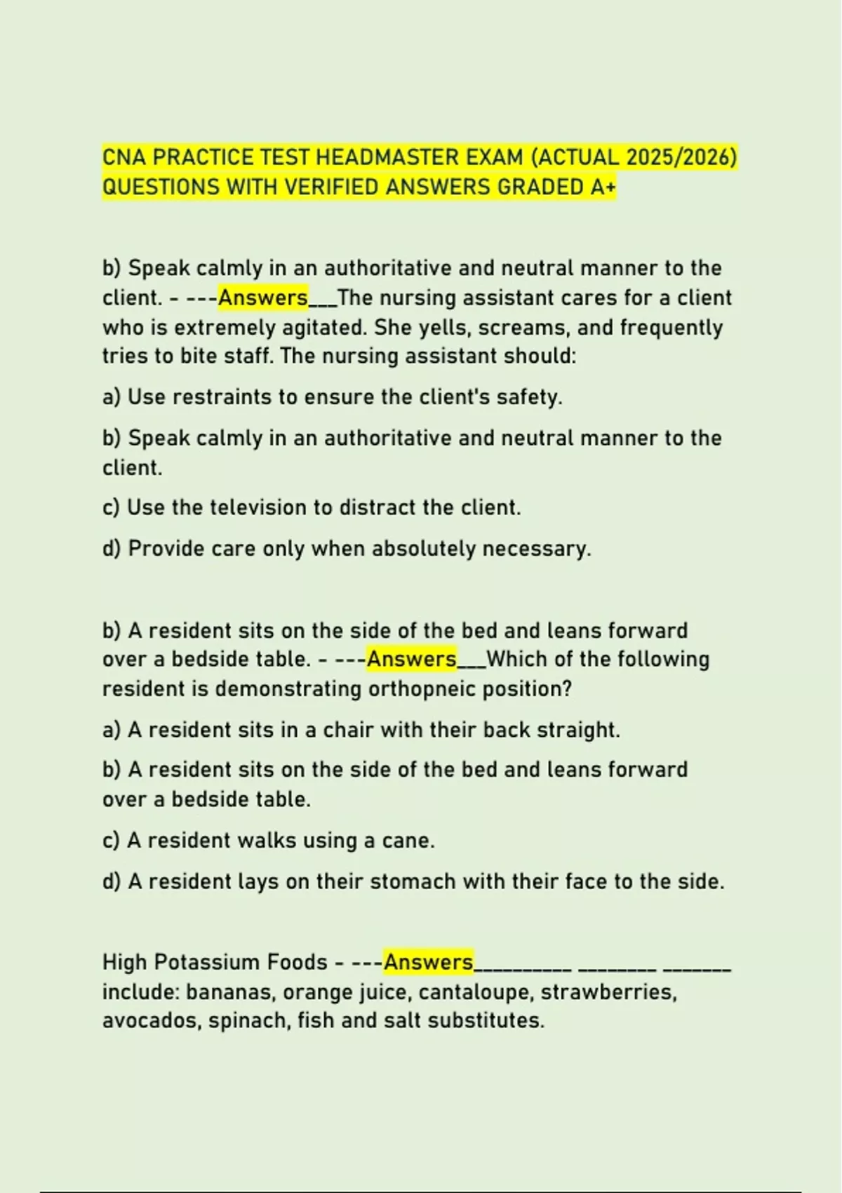 CNA PRACTICE TEST HEADMASTER EXAM (ACTUAL 2025/2026)