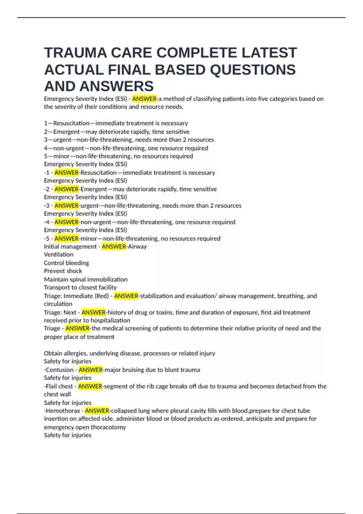 TRAUMA CARE COMPLETE LATEST ACTUAL FINAL BASED QUESTIONS AND ANSWERS