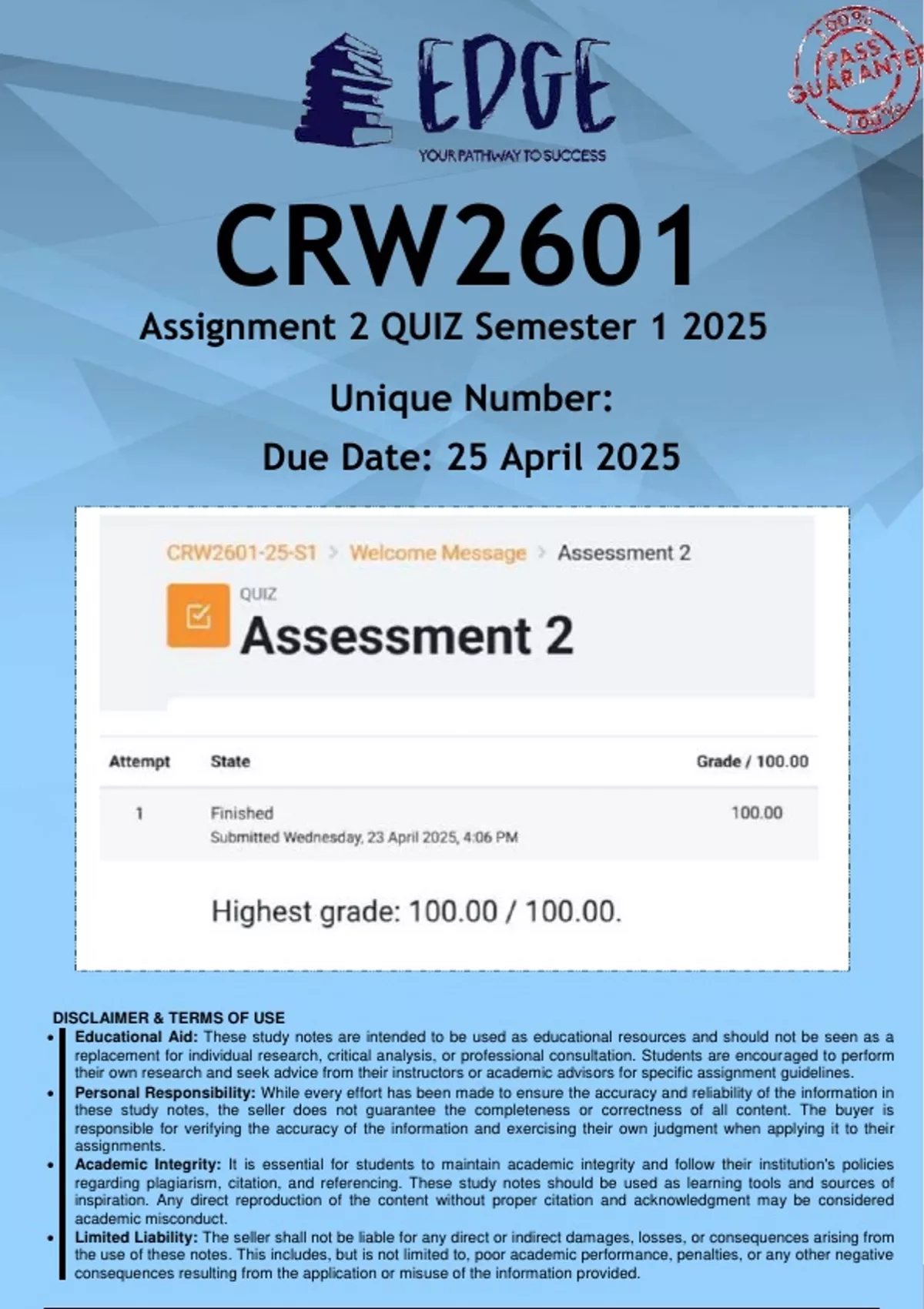 CRW2601 Assignment 2 (ANSWERS) Semester 1 2025 - DISTINCTION GUARANTEED