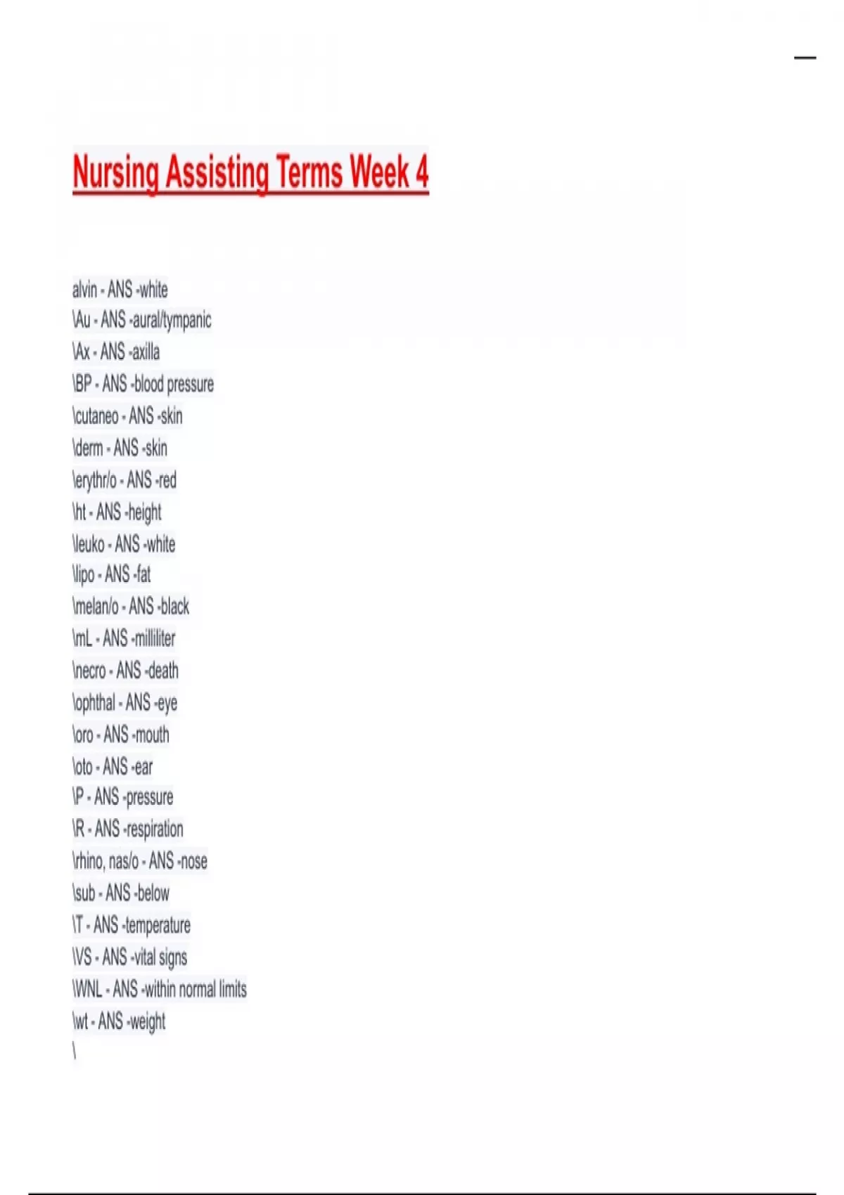 Nursing Assisting Terms Week 4 Exam 2025/2026 Questions With Completed Solutions.