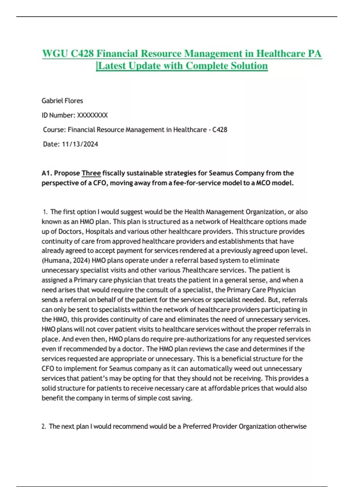 Course: Financial Resource Management in Healthcare - C428