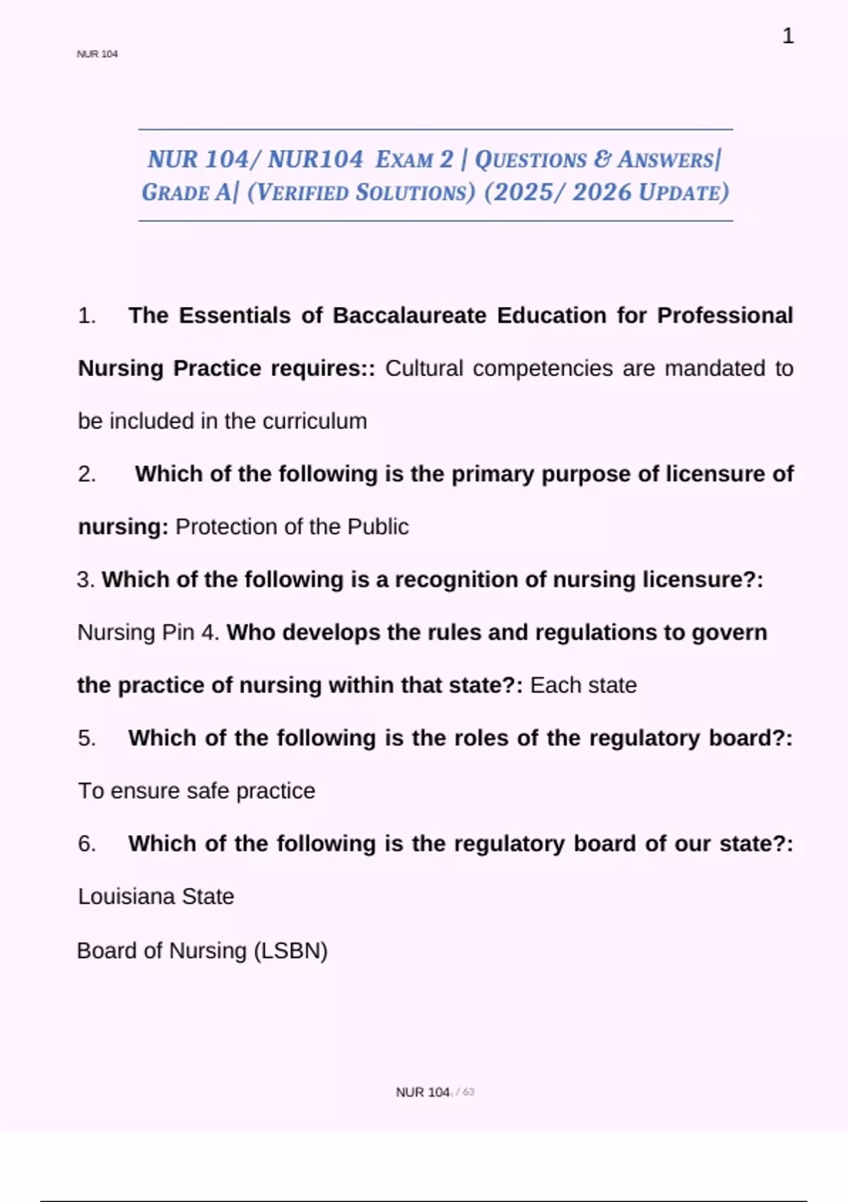 NUR 104/ NUR104 EXAM 2 | QUESTIONS & ANSWERS| GRADE A| (VERIFIED SOLUTIONS) (2025/ 2026 UPDATE)