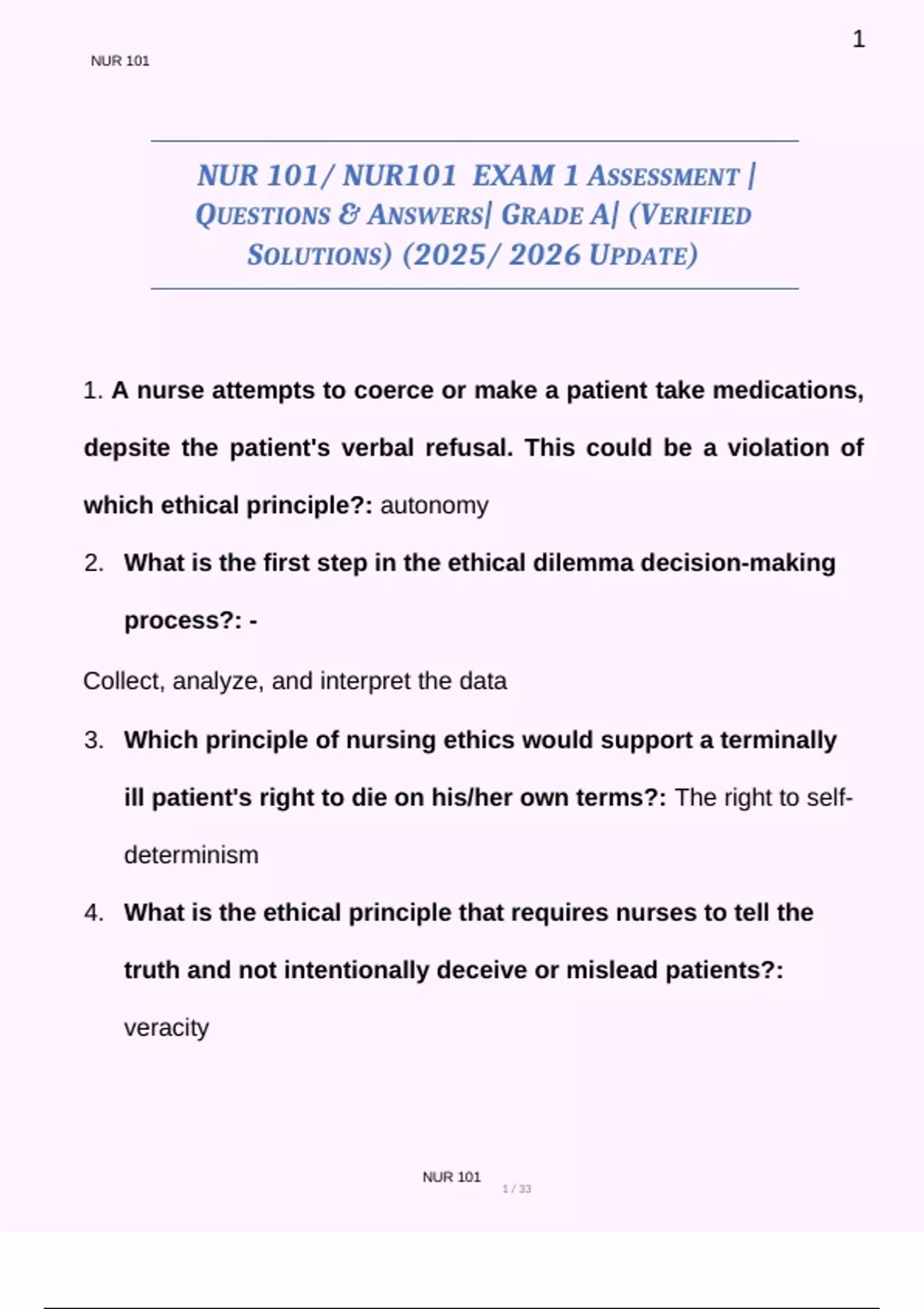 NUR 101/ NUR101 EXAM 1 ASSESSMENT |
