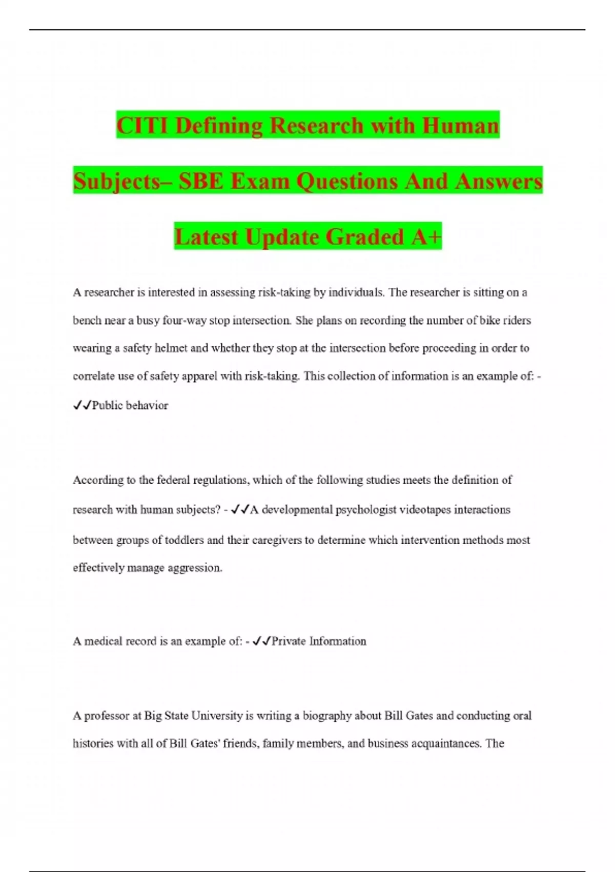 CITI Defining Research with Human Subjects– SBE Exam Questions And Answers Latest Update Graded A+