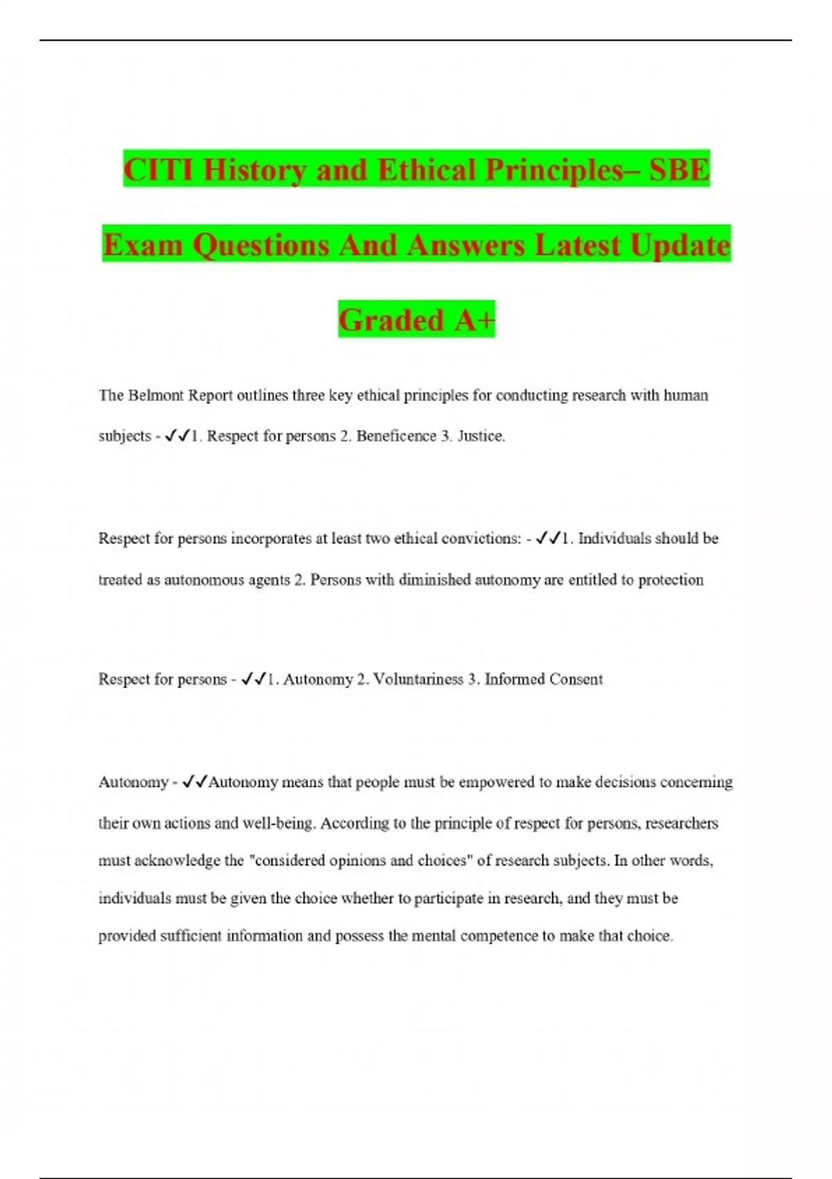 CITI History and Ethical Principles– SBE Exam Questions And Answers Latest Update Graded A+