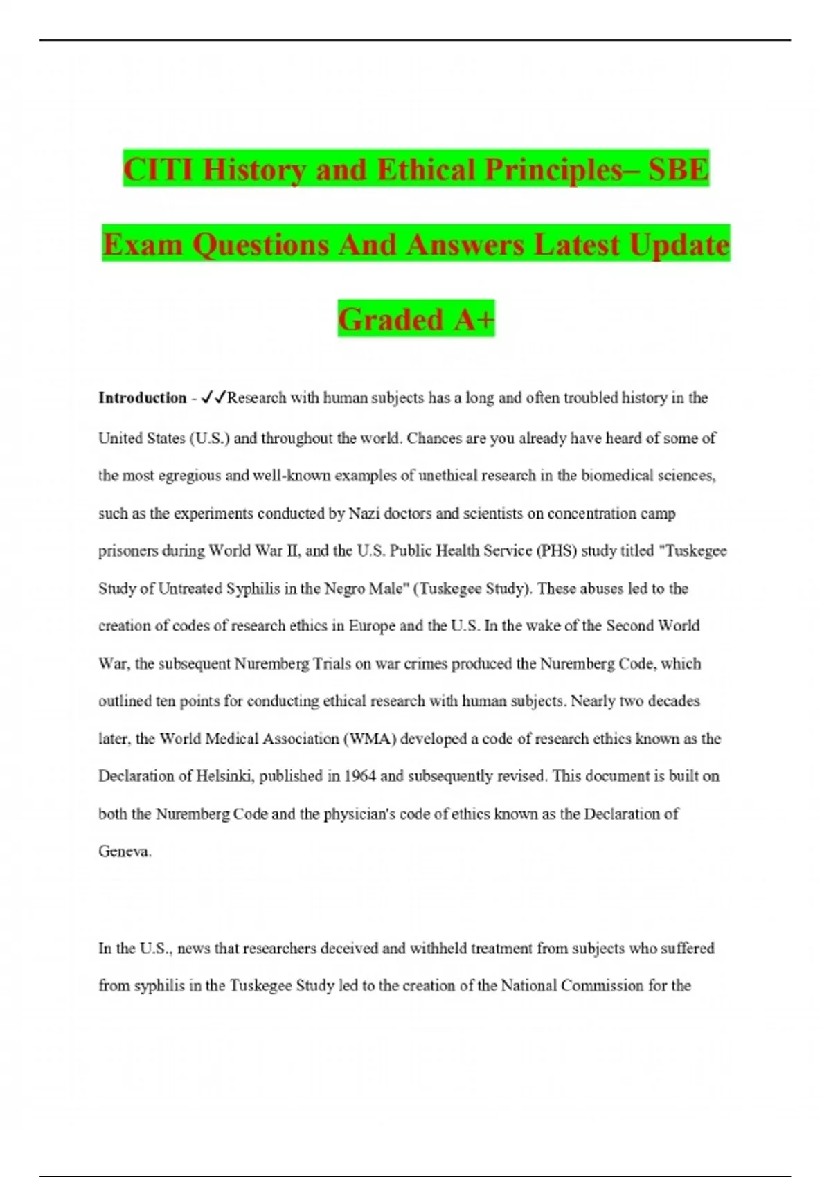 CITI History and Ethical Principles– SBE Exam Questions And Answers Latest Update Graded A+