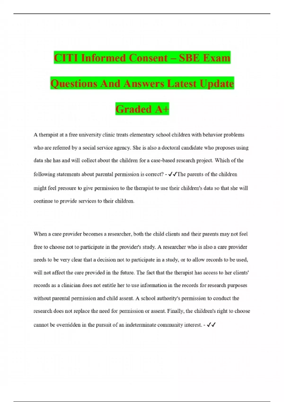 CITI Informed Consent – SBE Exam Questions And Answers Latest Update Graded A+