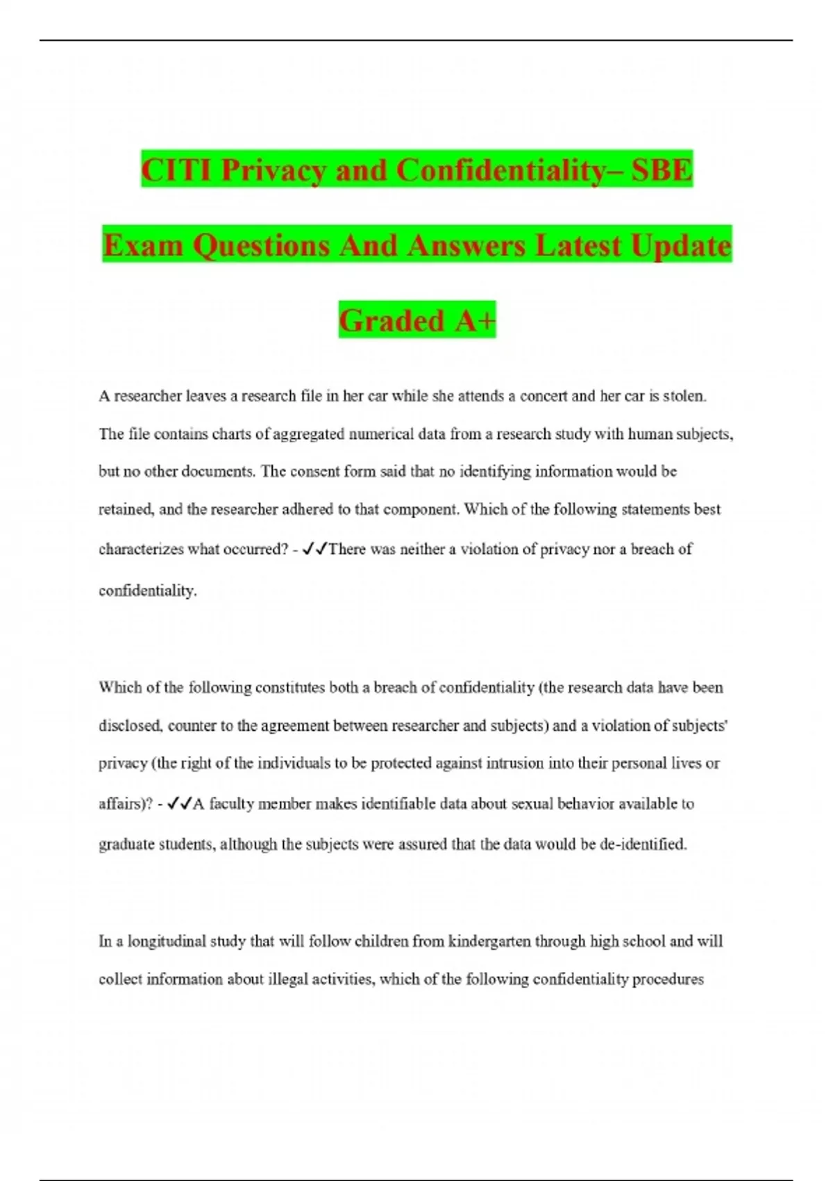 CITI Privacy and Confidentiality– SBE Exam Questions And Answers Latest Update Graded A+