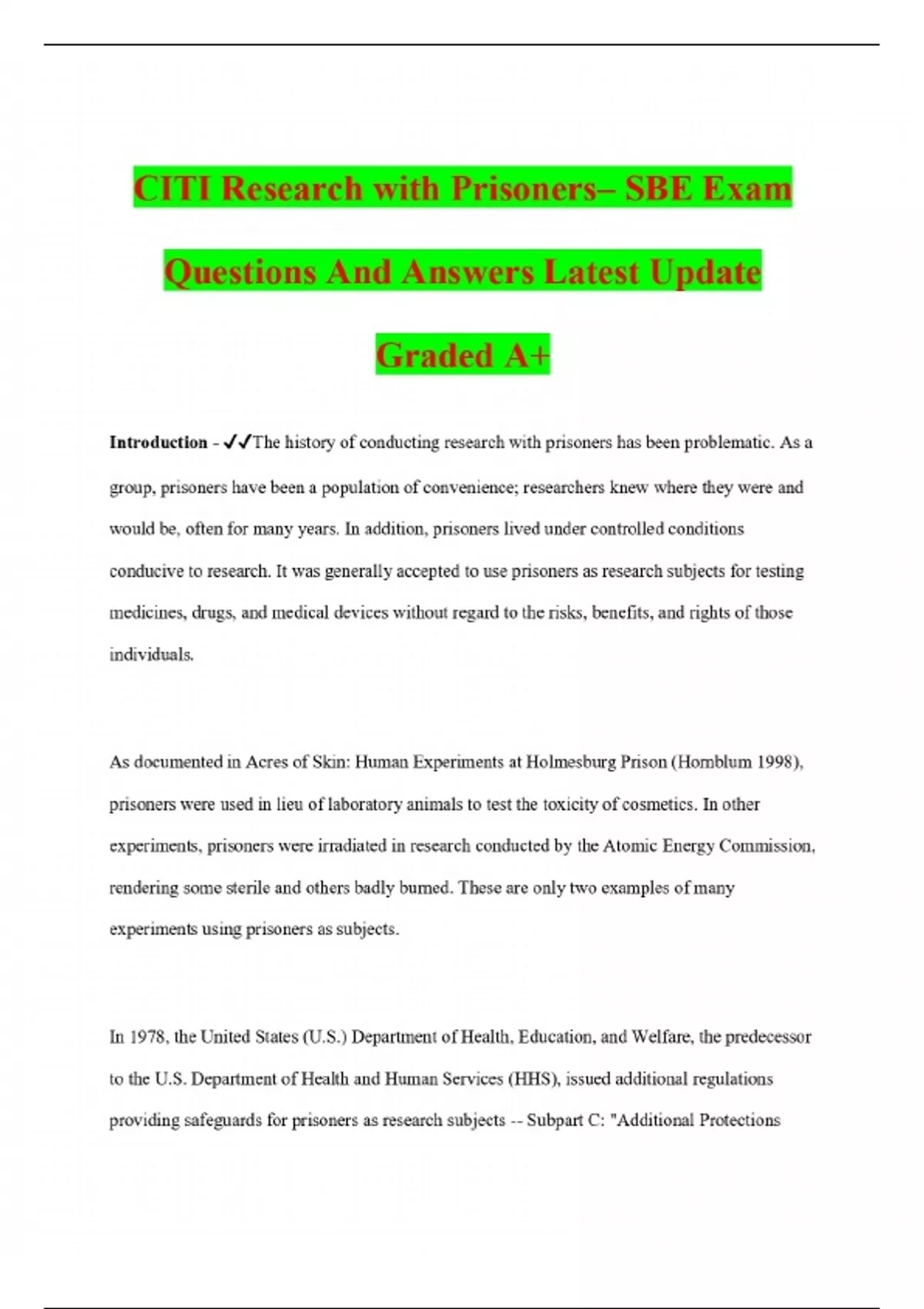 CITI Research with Prisoners– SBE Exam Questions And Answers Latest Update Graded A+