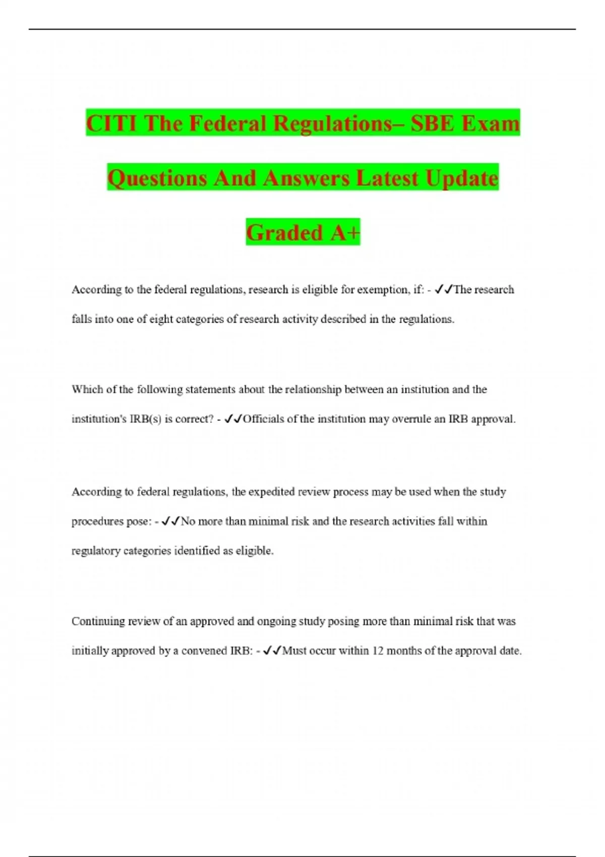 CITI The Federal Regulations– SBE Exam Questions And Answers Latest Update Graded A+