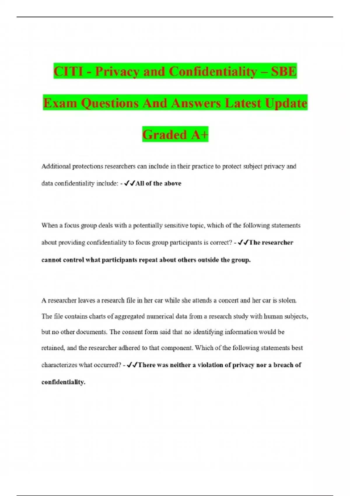 CITI - Privacy and Confidentiality – SBE Exam Questions And Answers Latest Update Graded A+ Additional protections researchers can include in their practice to protect subject privacy and data confidentiality include: - All of the above