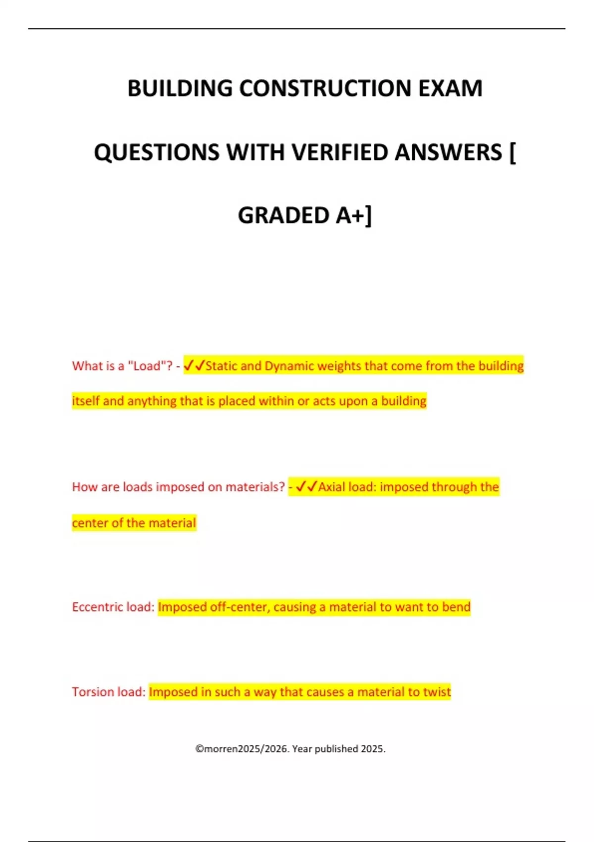 ©morren2025/2026. Year published 2025. BUILDING CONSTRUCTION EXAM QUESTIONS WITH VERIFIED ANSWERS [ GRADED A+] What is a "Load"? - Static and Dynamic weights that come from the building itself and anything that is placed within or acts upon a building How are loads imposed on materials? - Axial load: imposed through the center of the material Eccentric load: Imposed off-center, causing a material to want to bend Torsion load: Imposed in such a way that causes a material to twist