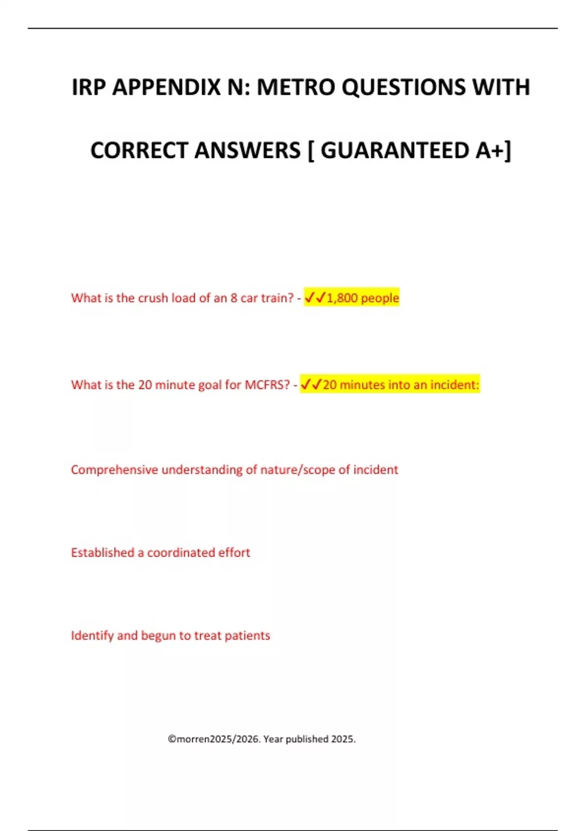 ©morren2025/2026. Year published 2025. IRP APPENDIX N: METRO QUESTIONS WITH CORRECT ANSWERS [ GUARANTEED A+] What is the crush load of an 8 car train? - 1,800 people What is the 20 minute goal for MCFRS? - 20 minutes into an incident: Comprehensive understanding of nature/scope of incident Established a coordinated effort Identify and begun to treat patients