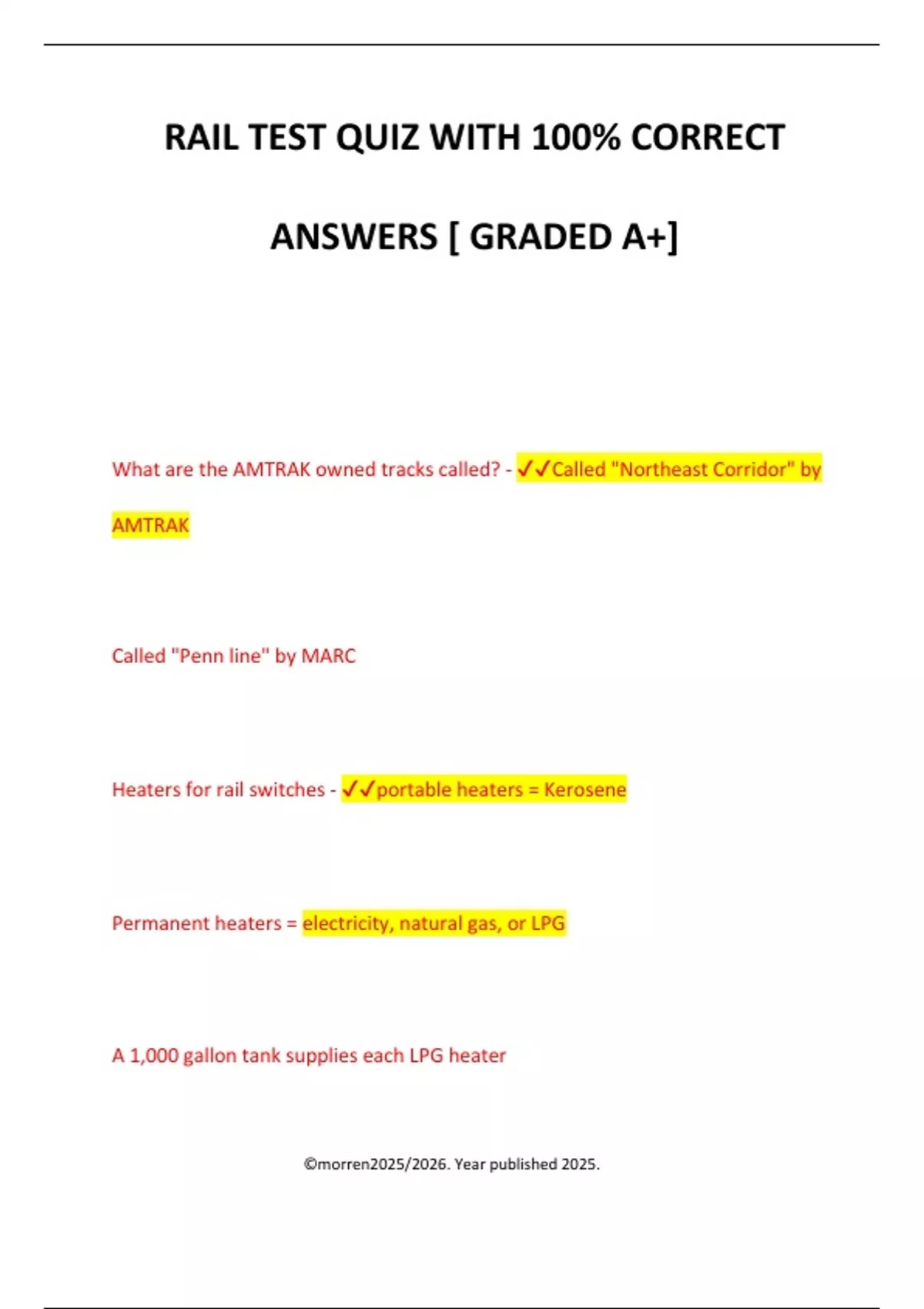 ©morren2025/2026. Year published 2025. RAIL TEST QUIZ WITH 100% CORRECT ANSWERS [ GRADED A+] What are the AMTRAK owned tracks called? - Called "Northeast Corridor" by AMTRAK Called "Penn line" by MARC Heaters for rail switches - portable heaters = Kerosene Permanent heaters = electricity, natural gas, or LPG A 1,000 gallon tank supplies each LPG heater