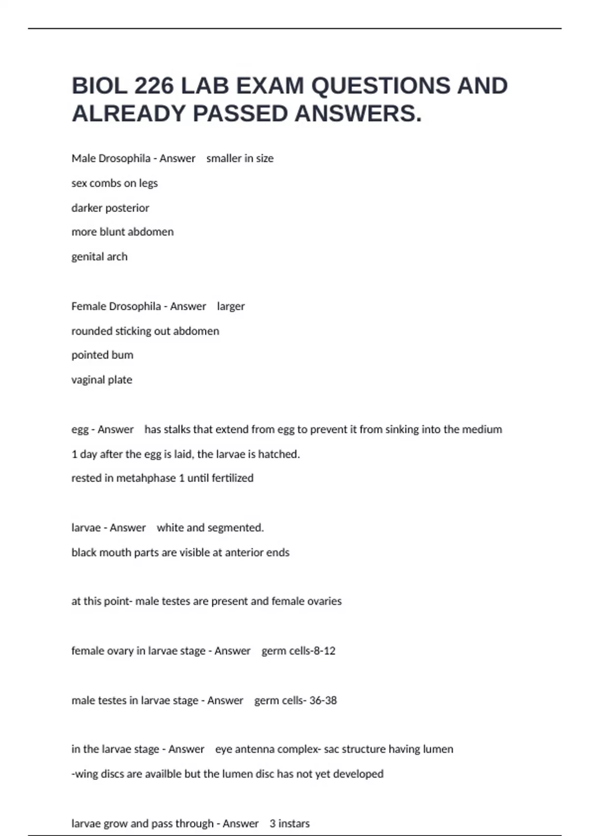 Male Drosophila - Answer smaller in size sex combs on legs darker posterior more blunt abdomen genital arch Female Drosophila - Answer larger rounded sticking out abdomen pointed bum vaginal plate egg - Answer has stalks that extend from egg to prevent it from sinking into the medium 1 day after the egg is laid, the larvae is hatched. rested in metahphase 1 until fertilized larvae - Answer white and segmented. black mouth parts are visible at anterior ends at this point- male testes are present and female ovaries female ovary in larvae stage - Answer germ cells-8-12 male testes in larvae stage - Answer germ cells- 36-38 in the larvae stage - Answer eye antenna complex- sac structure having lumen -wing discs are availble but the lumen disc has not yet developed larvae grow and pass through - Answer 3 instars 1st and 2nd instar take 1 day intervals 3rd instar takes 2 day interval