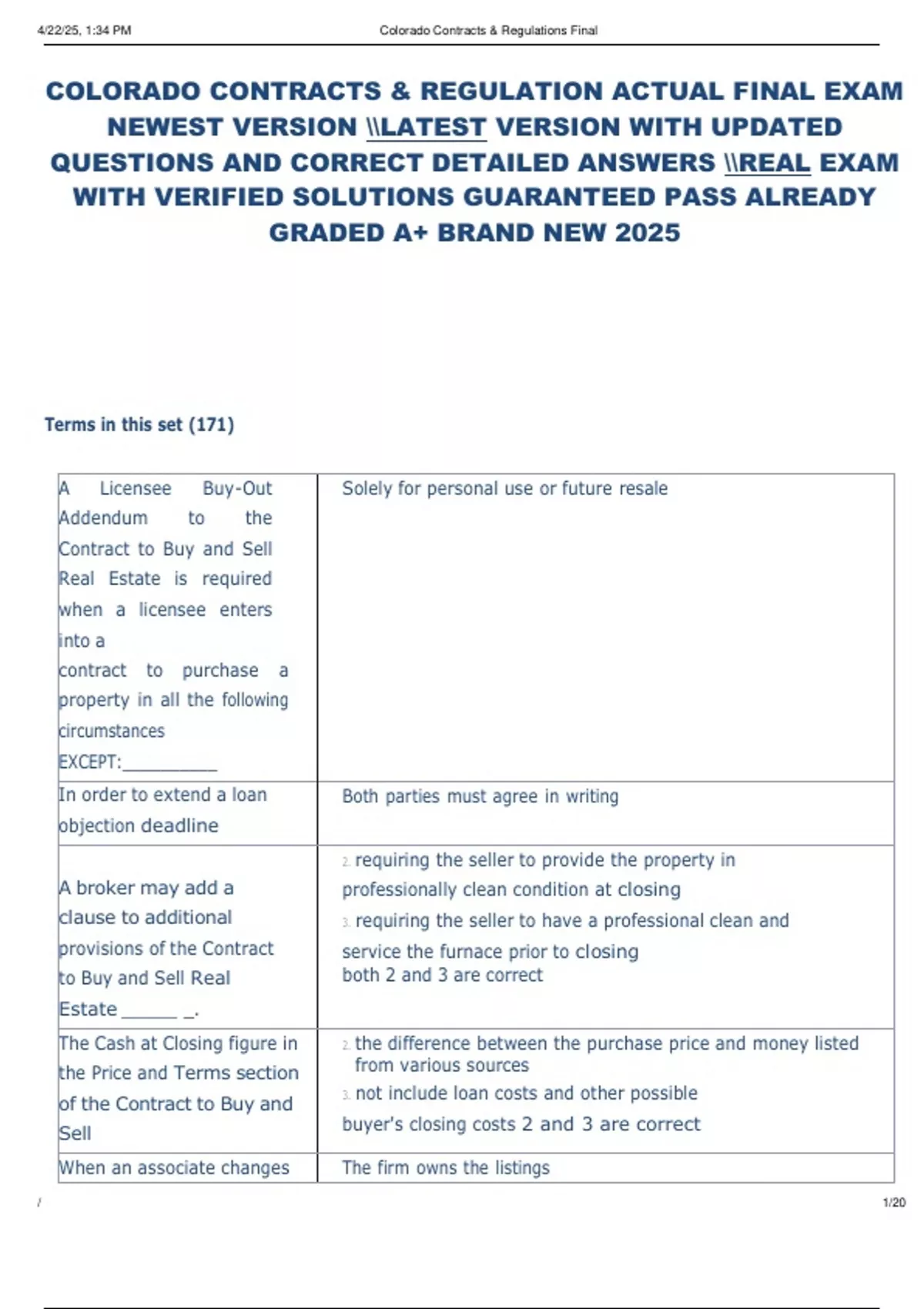 COLORADO CONTRACTS & REGULATION ACTUAL FINAL EXAM NEWEST VERSION LATEST VERSION WITH UPDATED QUESTIONS AND CORRECT DETAILED ANSWERS REAL EXAM WITH VERIFIED SOLUTIONS GUARANTEED PASS ALREADY GRADED A+ BRAND NEW 2025 COLORADO CONTRACTS & REGULATION ACTUAL FINAL EXAM NEWEST VERSION LATEST VERSION WITH UPDATED QUESTIONS AND CORRECT DETAILED ANSWERS REAL EXAM WITH VERIFIED SOLUTIONS GUARANTEED PASS ALREADY GRADED A+ BRAND NEW 2025 COLORADO CONTRACTS & REGULATION ACTUAL FINAL EXAM NEWEST VERSION LATEST VERSION WITH UPDATED QUESTIONS AND CORRECT DETAILED ANSWERS REAL EXAM WITH VERIFIED SOLUTIONS GUARANTEED PASS ALREADY GRADED A+ BRAND NEW 2025 COLORADO CONTRACTS & REGULATION ACTUAL FINAL EXAM NEWEST VERSION LATEST VERSION WITH UPDATED QUESTIONS AND CORRECT DETAILED ANSWERS REAL EXAM WITH VERIFIED SOLUTIONS GUARANTEED PASS ALREADY GRADED A+ BRAND NEW 2025 COLORADO CONTRACTS & REGULATION ACTUAL FINAL EXAM NEWEST VERSION LATEST VERSION WITH UPDATED QUESTIONS AND CORRECT DETAILED ANSWERS REAL EXAM WITH VERIFIED SOLUTIONS GUARANTEED PASS ALREADY GRADED A+ BRAND NEW 2025 COLORADO CONTRACTS & REGULATION ACTUAL FINAL EXAM NEWEST VERSION LATEST VERSION WITH UPDATED QUESTIONS AND CORRECT DETAILED ANSWERS REAL EXAM WITH VERIFIED SOLUTIONS GUARANTEED PASS ALREADY GRADED A+ BRAND NEW 2025 COLORADO CONTRACTS & REGULATION ACTUAL FINAL EXAM NEWEST VERSION LATEST VERSION WITH UPDATED QUESTIONS AND CORRECT DETAILED ANSWERS REAL EXAM WITH VERIFIED SOLUTIONS GUARANTEED PASS ALREADY GRADED A+ BRAND NEW 2025 COLORADO CONTRACTS & REGULATION ACTUAL FINAL EXAM NEWEST VERSION LATEST VERSION WITH UPDATED QUESTIONS AND CORRECT DETAILED ANSWERS REAL EXAM WITH VERIFIED SOLUTIONS GUARANTEED PASS ALREADY GRADED A+ BRAND NEW 2025 COLORADO CONTRACTS & REGULATION ACTUAL FINAL EXAM NEWEST VERSION LATEST VERSION WITH UPDATED QUESTIONS AND CORRECT DETAILED ANSWERS REAL EXAM WITH VERIFIED SOLUTIONS GUARANTEED PASS ALREADY GRADED A+ BRAND NEW 2025 COLORADO CONTRACTS & REGULATION ACTUAL FINAL EXAM NEWEST VERSION LATEST VERSION WITH UPDATED QUESTIONS AND CORRECT DETAILED ANSWERS REAL EXAM WITH VERIFIED SOLUTIONS GUARANTEED PASS ALREADY GRADED A+ BRAND NEW 2025 COLORADO CONTRACTS & REGULATION ACTUAL FINAL EXAM NEWEST VERSION LATEST VERSION WITH UPDATED QUESTIONS AND CORRECT DETAILED ANSWERS REAL EXAM WITH VERIFIED SOLUTIONS GUARANTEED PASS ALREADY GRADED A+ BRAND NEW 2025 COLORADO CONTRACTS & REGULATION ACTUAL FINAL EXAM NEWEST VERSION LATEST VERSION WITH UPDATED QUESTIONS AND CORRECT DETAILED ANSWERS REAL EXAM WITH VERIFIED SOLUTIONS GUARANTEED PASS ALREADY GRADED A+ BRAND NEW 2025 COLORADO CONTRACTS & REGULATION ACTUAL FINAL EXAM NEWEST VERSION LATEST VERSION WITH UPDATED QUESTIONS AND CORRECT DETAILED ANSWERS REAL EXAM WITH VERIFIED SOLUTIONS GUARANTEED PASS ALREADY GRADED A+ BRAND NEW 2025 COLORADO CONTRACTS & REGULATION ACTUAL FINAL EXAM NEWEST VERSION LATEST VERSION WITH UPDATED QUESTIONS AND CORRECT DETAILED ANSWERS REAL EXAM WITH VERIFIED SOLUTIONS GUARANTEED PASS ALREADY GRADED A+ BRAND NEW 2025 COLORADO CONTRACTS & REGULATION ACTUAL FINAL EXAM NEWEST VERSION LATEST VERSION WITH UPDATED QUESTIONS AND CORRECT DETAILED ANSWERS REAL EXAM WITH VERIFIED SOLUTIONS GUARANTEED PASS ALREADY GRADED A+ BRAND NEW 2025 COLORADO CONTRACTS & REGULATION ACTUAL FINAL EXAM NEWEST VERSION LATEST VERSION WITH UPDATED QUESTIONS AND CORRECT DETAILED ANSWERS REAL EXAM WITH VERIFIED SOLUTIONS GUARANTEED PASS ALREADY GRADED A+ BRAND NEW 2025 COLORADO CONTRACTS & REGULATION ACTUAL FINAL EXAM NEWEST VERSION LATEST VERSION WITH UPDATED QUESTIONS AND CORRECT DETAILED ANSWERS REAL EXAM WITH VERIFIED SOLUTIONS GUARANTEED PASS ALREADY GRADED A+ BRAND NEW 2025 COLORADO CONTRACTS & REGULATION ACTUAL FINAL EXAM NEWEST VERSION LATEST VERSION WITH UPDATED QUESTIONS AND CORRECT DETAILED ANSWERS REAL EXAM WITH VERIFIED SOLUTIONS GUARANTEED PASS ALREADY GRADED A+ BRAND NEW 2025 COLORADO CONTRACTS & REGULATION ACTUAL FINAL EXAM NEWEST VERSION LATEST VERSION WITH UPDATED QUESTIONS AND CORRECT DETAILED ANSWERS REAL EXAM WITH VERIFIED SOLUTIONS GUARANTEED PASS ALREADY GRADED A+ BRAND NEW 2025 COLORADO CONTRACTS & REGULATION ACTUAL FINAL EXAM NEWEST VERSION LATEST VERSION WITH UPDATED QUESTIONS AND CORRECT DETAILED ANSWERS REAL EXAM WITH VERIFIED SOLUTIONS GUARANTEED PASS ALREADY GRADED A+ BRAND NEW 2025 COLORADO CONTRACTS & REGULATION ACTUAL FINAL EXAM NEWEST VERSION LATEST VERSION WITH UPDATED QUESTIONS AND CORRECT DETAILED ANSWERS REAL EXAM WITH VERIFIED SOLUTIONS GUARANTEED PASS ALREADY GRADED A+ BRAND NEW 2025 COLORADO CONTRACTS & REGULATION ACTUAL FINAL EXAM NEWEST VERSION LATEST VERSION WITH UPDATED QUESTIONS AND CORRECT DETAILED ANSWERS REAL EXAM WITH VERIFIED SOLUTIONS GUARANTEED PASS ALREADY GRADED A+ BRAND NEW 2025 COLORADO CONTRACTS & REGULATION ACTUAL FINAL EXAM NEWEST VERSION LATEST VERSION WITH UPDATED QUESTIONS AND CORRECT DETAILED ANSWERS REAL EXAM WITH VERIFIED SOLUTIONS GUARANTEED PASS ALREADY GRADED A+ BRAND NEW 2025 COLORADO CONTRACTS & REGULATION ACTUAL FINAL EXAM NEWEST VERSION LATEST VERSION WITH UPDATED QUESTIONS AND CORRECT DETAILED ANSWERS REAL EXAM WITH VERIFIED SOLUTIONS GUARANTEED PASS ALREADY GRADED A+ BRAND NEW 2025 COLORADO CONTRACTS & REGULATION ACTUAL FINAL EXAM NEWEST VERSION LATEST VERSION WITH UPDATED QUESTIONS AND CORRECT DETAILED ANSWERS REAL EXAM WITH VERIFIED SOLUTIONS GUARANTEED PASS ALREADY GRADED A+ BRAND NEW 2025 COLORADO CONTRACTS & REGULATION ACTUAL FINAL EXAM NEWEST VERSION LATEST VERSION WITH UPDATED QUESTIONS AND CORRECT DETAILED ANSWERS REAL EXAM WITH VERIFIED SOLUTIONS GUARANTEED PASS ALREADY GRADED A+ BRAND NEW 2025 COLORADO CONTRACTS & REGULATION ACTUAL FINAL EXAM NEWEST VERSION LATEST VERSION WITH UPDATED QUESTIONS AND CORRECT DETAILED ANSWERS REAL EXAM WITH VERIFIED SOLUTIONS GUARANTEED PASS ALREADY GRADED A+ BRAND NEW 2025