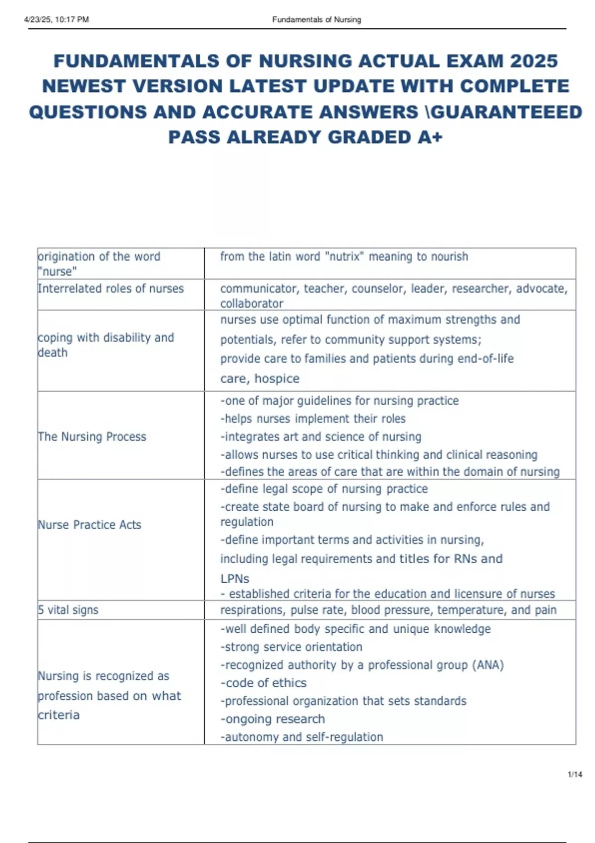 FUNDAMENTALS OF NURSING ACTUAL EXAM 2025 NEWEST VERSION LATEST UPDATE WITH COMPLETE QUESTIONS AND ACCURATE ANSWERS GUARANTEEED PASS ALREADY GRADED A+