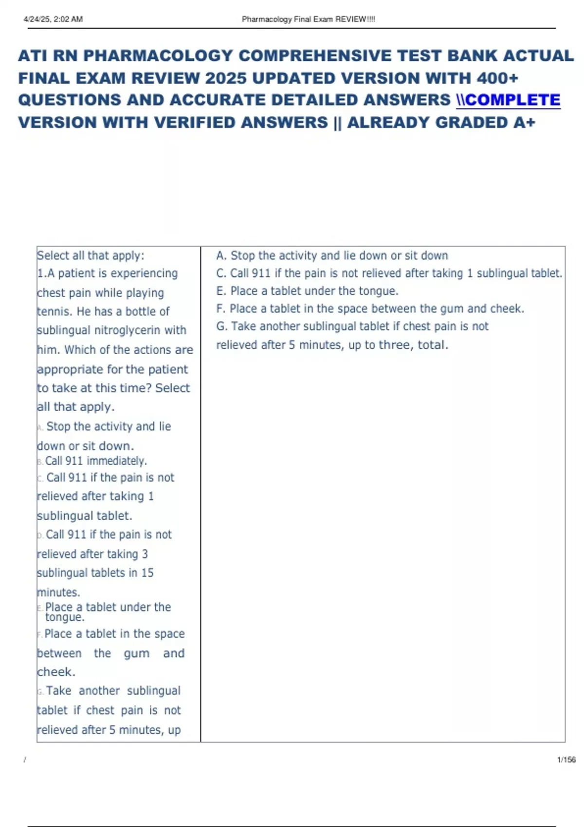 ATI RN PHARMACOLOGY COMPREHENSIVE TEST BANK ACTUAL FINAL EXAM REVIEW 2025 UPDATED VERSION WITH 400+ QUESTIONS AND ACCURATE DETAILED ANSWERS COMPLETE VERSION WITH VERIFIED ANSWERS || ALREADY GRADED A+ ATI RN PHARMACOLOGY COMPREHENSIVE TEST BANK ACTUAL FINAL EXAM REVIEW 2025 UPDATED VERSION WITH 400+ QUESTIONS AND ACCURATE DETAILED ANSWERS COMPLETE VERSION WITH VERIFIED ANSWERS || ALREADY GRADED A+ ATI RN PHARMACOLOGY COMPREHENSIVE TEST BANK ACTUAL FINAL EXAM REVIEW 2025 UPDATED VERSION WITH 400+ QUESTIONS AND ACCURATE DETAILED ANSWERS COMPLETE VERSION WITH VERIFIED ANSWERS || ALREADY GRADED A+ ATI RN PHARMACOLOGY COMPREHENSIVE TEST BANK ACTUAL FINAL EXAM REVIEW 2025 UPDATED VERSION WITH 400+ QUESTIONS AND ACCURATE DETAILED ANSWERS COMPLETE VERSION WITH VERIFIED ANSWERS || ALREADY GRADED A+ ATI RN PHARMACOLOGY COMPREHENSIVE TEST BANK ACTUAL FINAL EXAM REVIEW 2025 UPDATED VERSION WITH 400+ QUESTIONS AND ACCURATE DETAILED ANSWERS COMPLETE VERSION WITH VERIFIED ANSWERS || ALREADY GRADED A+ ATI RN PHARMACOLOGY COMPREHENSIVE TEST BANK ACTUAL FINAL EXAM REVIEW 2025 UPDATED VERSION WITH 400+ QUESTIONS AND ACCURATE DETAILED ANSWERS COMPLETE VERSION WITH VERIFIED ANSWERS || ALREADY GRADED A+ ATI RN PHARMACOLOGY COMPREHENSIVE TEST BANK ACTUAL FINAL EXAM REVIEW 2025 UPDATED VERSION WITH 400+ QUESTIONS AND ACCURATE DETAILED ANSWERS COMPLETE VERSION WITH VERIFIED ANSWERS || ALREADY GRADED A+ ATI RN PHARMACOLOGY COMPREHENSIVE TEST BANK ACTUAL FINAL EXAM REVIEW 2025 UPDATED VERSION WITH 400+ QUESTIONS AND ACCURATE DETAILED ANSWERS COMPLETE VERSION WITH VERIFIED ANSWERS || ALREADY GRADED A+ ATI RN PHARMACOLOGY COMPREHENSIVE TEST BANK ACTUAL FINAL EXAM REVIEW 2025 UPDATED VERSION WITH 400+ QUESTIONS AND ACCURATE DETAILED ANSWERS COMPLETE VERSION WITH VERIFIED ANSWERS || ALREADY GRADED A+ ATI RN PHARMACOLOGY COMPREHENSIVE TEST BANK ACTUAL FINAL EXAM REVIEW 2025 UPDATED VERSION WITH 400+ QUESTIONS AND ACCURATE DETAILED ANSWERS COMPLETE VERSION WITH VERIFIED ANSWERS || ALREADY GRADED A+ATI RN PHARMACOLOGY COMPREHENSIVE TEST BANK ACTUAL FINAL EXAM REVIEW 2025 UPDATED VERSION WITH 400+ QUESTIONS AND ACCURATE DETAILED ANSWERS COMPLETE VERSION WITH VERIFIED ANSWERS || ALREADY GRADED A+ ATI RN PHARMACOLOGY COMPREHENSIVE TEST BANK ACTUAL FINAL EXAM REVIEW 2025 UPDATED VERSION WITH 400+ QUESTIONS AND ACCURATE DETAILED ANSWERS COMPLETE VERSION WITH VERIFIED ANSWERS || ALREADY GRADED A+ ATI RN PHARMACOLOGY COMPREHENSIVE TEST BANK ACTUAL FINAL EXAM REVIEW 2025 UPDATED VERSION WITH 400+ QUESTIONS AND ACCURATE DETAILED ANSWERS COMPLETE VERSION WITH VERIFIED ANSWERS || ALREADY GRADED A+ ATI RN PHARMACOLOGY COMPREHENSIVE TEST BANK ACTUAL FINAL EXAM REVIEW 2025 UPDATED VERSION WITH 400+ QUESTIONS AND ACCURATE DETAILED ANSWERS COMPLETE VERSION WITH VERIFIED ANSWERS || ALREADY GRADED A+ ATI RN PHARMACOLOGY ATI RN PHARMACOLOGY COMPREHENSIVE TEST BANK ACTUAL FINAL EXAM REVIEW 2025 UPDATED VERSION WITH 400+ QUESTIONS AND ACCURATE DETAILED ANSWERS COMPLETE VERSION WITH VERIFIED ANSWERS || ALREADY GRADED A+ATI RN PHARMACOLOGY COMPREHENSIVE TEST BANK ACTUAL FINAL EXAM REVIEW 2025 UPDATED VERSION WITH 400+ QUESTIONS AND ACCURATE DETAILED ANSWERS COMPLETE VERSION WITH VERIFIED ANSWERS || ALREADY GRADED A+COMPREHENSIVE TEST BANK ACTUAL FINAL EXAM REVIEW 2025 UPDATED VERSION WITH 400+ QUESTIONS AND ACCURATE DETAILED ANSWERS COMPLETE VERSION WITH VERIFIED ANSWERS || ALREADY GRADED A+
