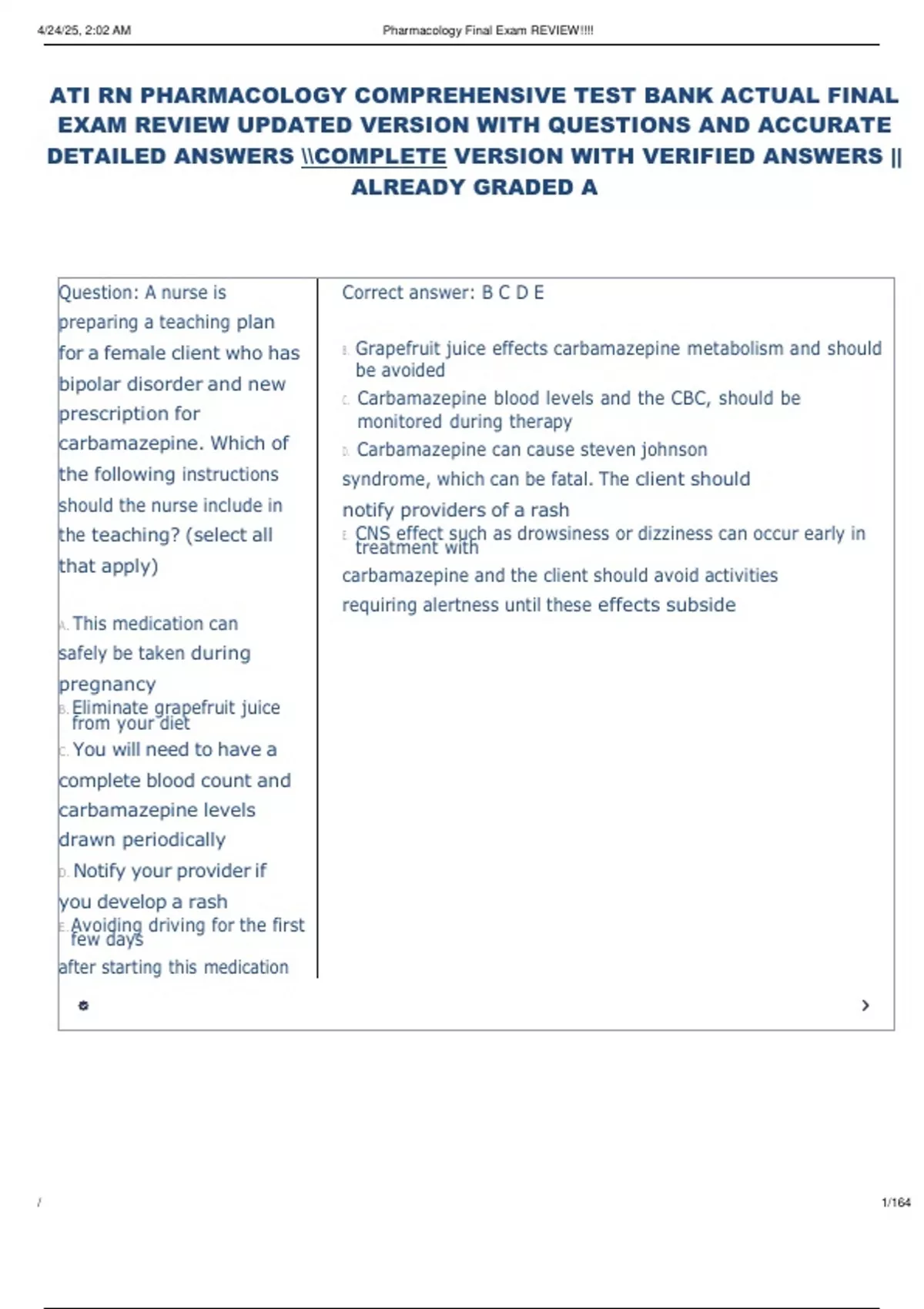 ATI RN PHARMACOLOGY COMPREHENSIVE TEST BANK ACTUAL FINAL