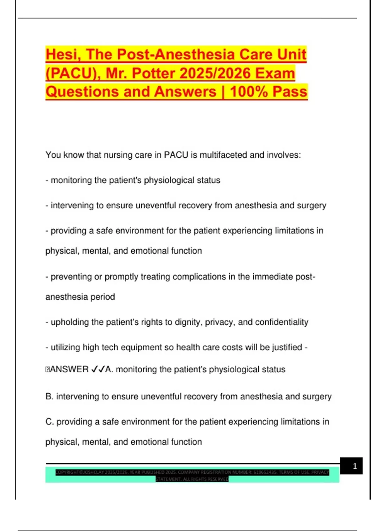 Hesi, The Post-Anesthesia Care Unit (PACU), Mr. Potter 2025/2026 Exam Questions and Answers | 100% Pass