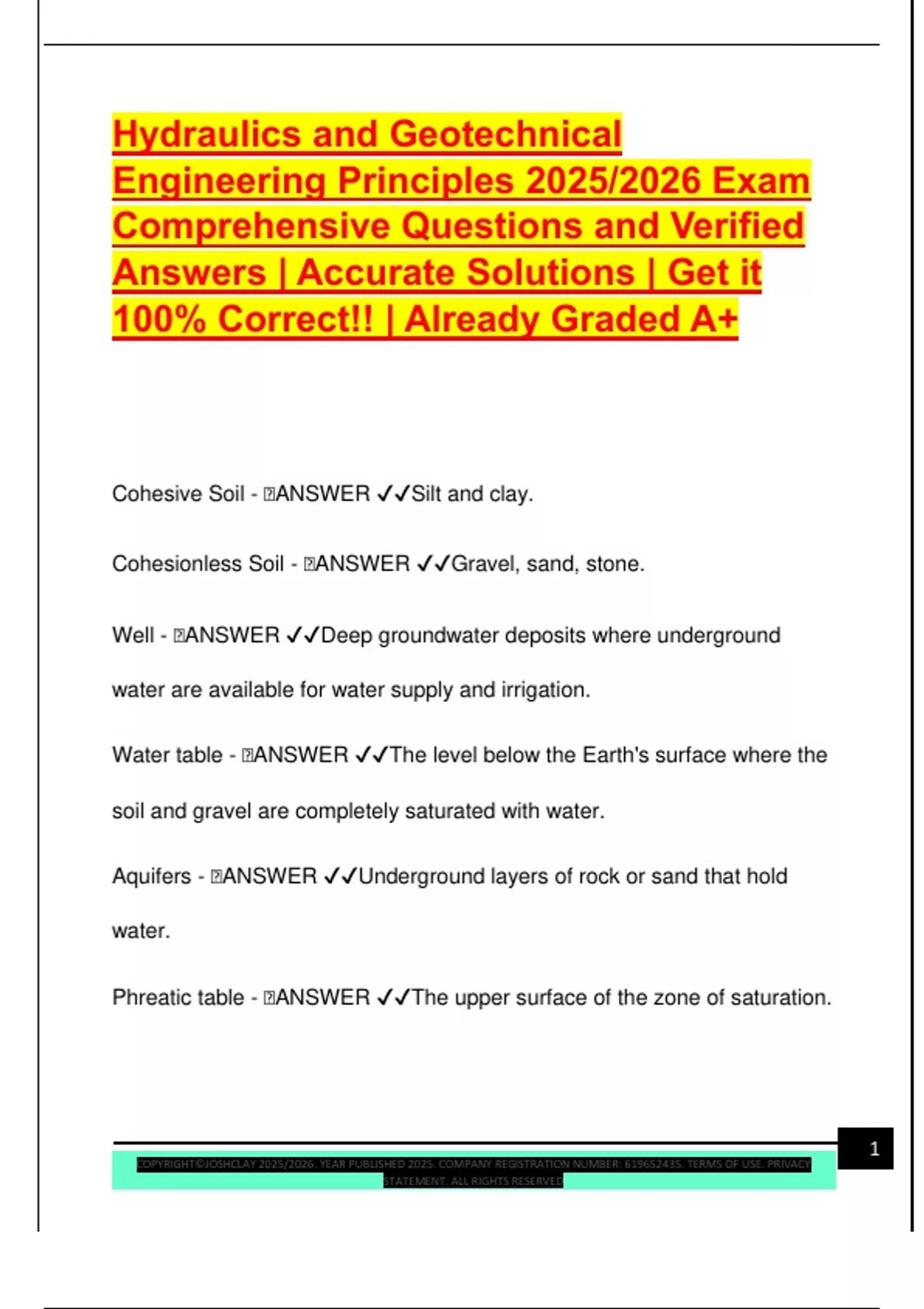 Hydraulics and Geotechnical Engineering Principles 2025/2026 Exam Comprehensive Questions and Verified Answers | Accurate Solutions | Get it 100% Correct!! | Already Graded A+ Cohesive Soil -