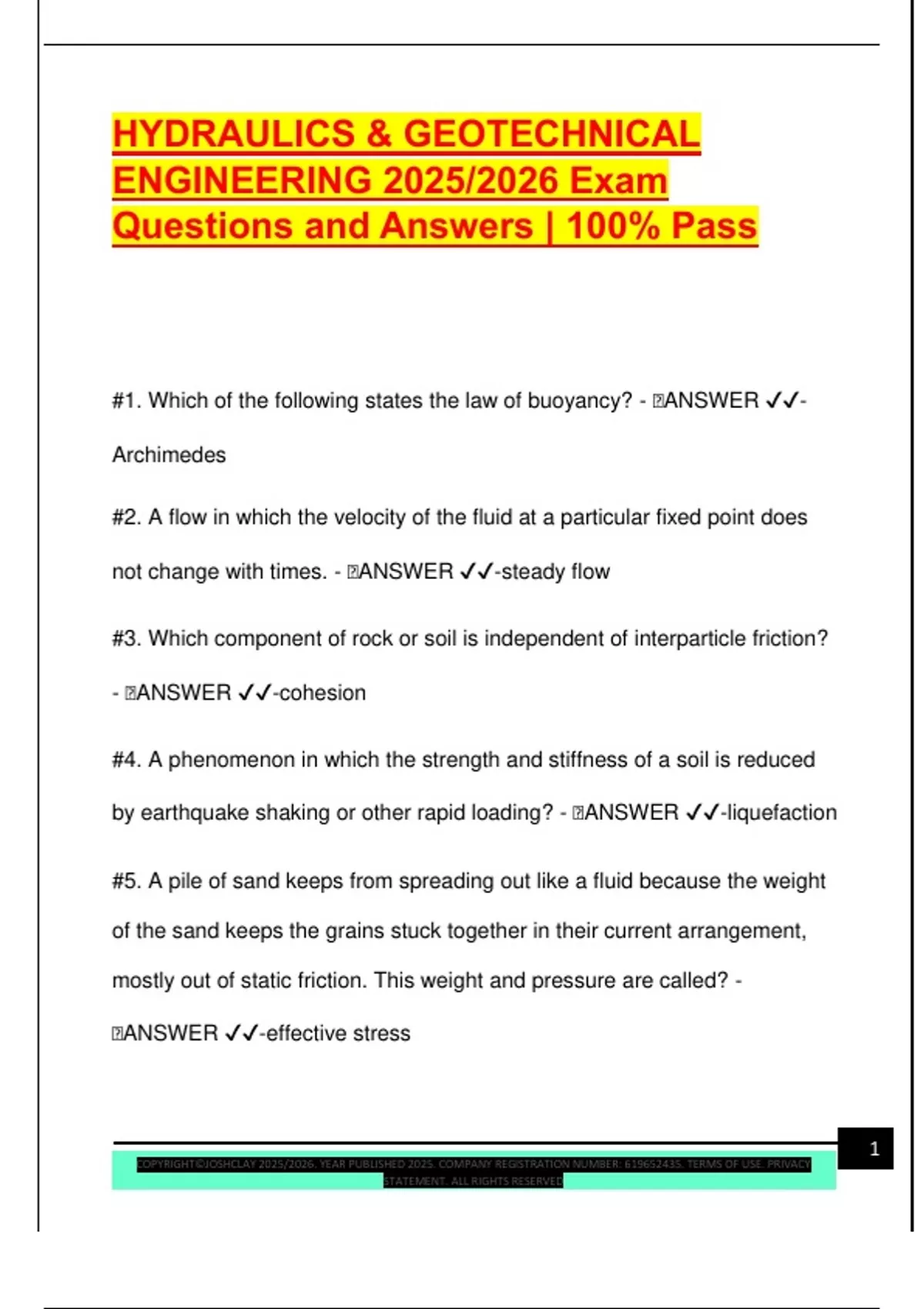 HYDRAULICS & GEOTECHNICAL ENGINEERING 2025/2026 Exam Questions and Answers | 100% Pass