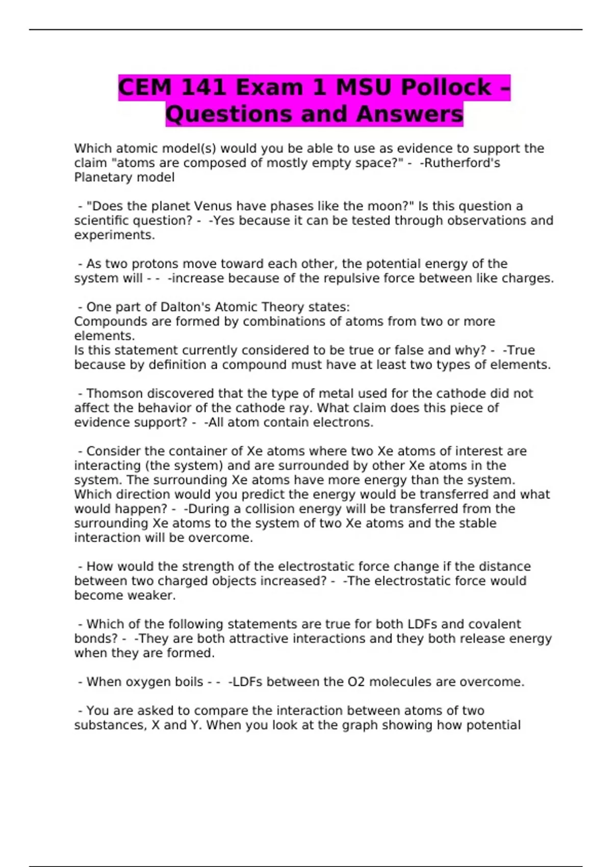 CEM 141 Exam 1 MSU Pollock – Questions and Answers