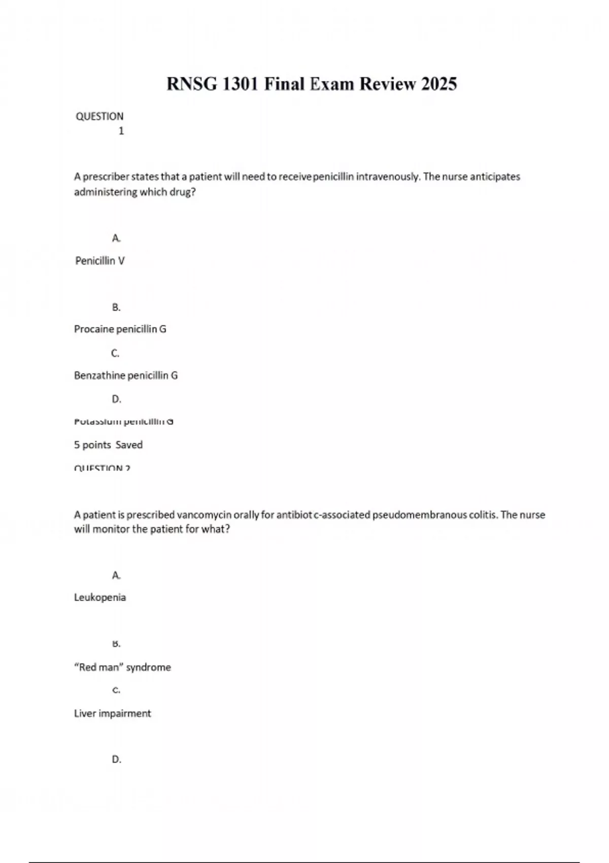 QUESTION 1 A prescriber states that a patient will need to receive penicillin intravenously. The nurse anticipates administering which drug? A. Penicillin V B. Procaine penicillin G C. Benzathine penicillin G D. Potassium penicillin G 5 points Saved QUESTION 2 A patient is prescribed vancomycin orally for antibiotic-associated pseudomembranous colitis. The nurse will monitor the patient for what? A. Leukopenia B. “Red man” syndrome C. Liver impairment D. Ototoxicity 5 points Saved QUESTION 3 A patient is prescribed cefazolin. It is most important for the nurse to teach the patient to avoid which substance while taking cefazolin? A. Warfarin B. Milk products C. Digitalis D. Alcohol 5 points Saved QUESTION 4 Before administering gentamycin, it is most important for the nurse to assess the patient for a history of what? A. Hypertension B. Myasthenia gravis C. Diabetes mellitus D. Asthma 5 points Saved QUESTION 5 The nurse is reviewing laboratory values from a patient who has been prescribed gentamicin. To prevent ototoxicity, it is most important for the nurse to monitor which value(s)? A. Serum creatinine and blood urea nitrogen levels B. Trough drug levels of gentamicin C. Peak drugs levels of gentamicin D. Serum alanine aminotransferase and aspartate aminotransferase levels 5 points Saved QUESTION 6 The nurse is caring for a patient receiving intravenous gentamicin for a severe bacterial infection. Which assessment finding by the nurse indicates the patient is experiencing an adverse effect of gentamycin therapy? A. Blurred vision B. Hand tremors C. Urinary frequency D. Tinnitus 5 points Saved QUESTION 7 Which patient does the nurse identify as most likely to need treatment with trimethoprim/sulfamethoxazole [Bactrim] for a period of 6 months? A. A female patient with acute pyelonephritis B. A male patient with acute prostatitis C. A patient with pyelonephritis with symptoms of high fever, chills, and severe flank pain D. A patient with acute cystitis who complains of dysuria, frequency, and urgency 5 points Saved QUESTION 8 Which patient should receive prophylactic antibiotic therapy? A. A patient who is to have his teeth cleaned B. A patient who is scheduled for a hysterectomy C. A patient with a white blood cell count of 8000 cells/mm3 D. A patient with a high fever without an identifiable cause 5 points Saved QUESTION 9 A patient is prescribed doxycycline [Vibramycin]. If the patient complains of gastric irritation, what should the nurse do? A. Instruct the patient to take the medication with milk B. Tell the patient to take an antacid with the medication C. Give the patient food, such as crackers or toast, with the medication D. Have the patient stop the medication immediately and contact the health care provider 5 points Saved QUESTION 10 Which patient would most likely need intravenous antibiotic therapy to treat a urinary tract infection? A. A patient with an uncomplicated urinary tract infection caused by Escherichia coli B. A patient with pyelonephritis with symptoms of high fever, chills, and severe flank pain C. A patient with acute cystitis who complains of dysuria, frequency, and urgency D. A patient with acute bacterial prostatitis with a mild fever, chills, and nocturia 5 points Saved QUESTION 11 Which drug does the nurse identify as a urinary tract antiseptic? A. Ciprofloxacin B. Ceftriaxone C. Nitrofurantoin D. Ceftazidime 5 points Saved QUESTION 12 Before administering erythromycin to a patient for an upper respiratory tract infection, it is most important for the nurse to determine if the patient is also prescribed which drug? A. Guaifenesin [Guiatuss] B. Hydrocodone [Vicodin] C. Nitroglycerin [Tridil] D. Verapamil [Calan]