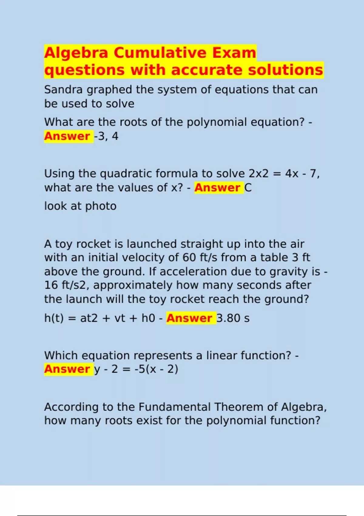 Algebra Cumulative Exam questions with accurate solutions