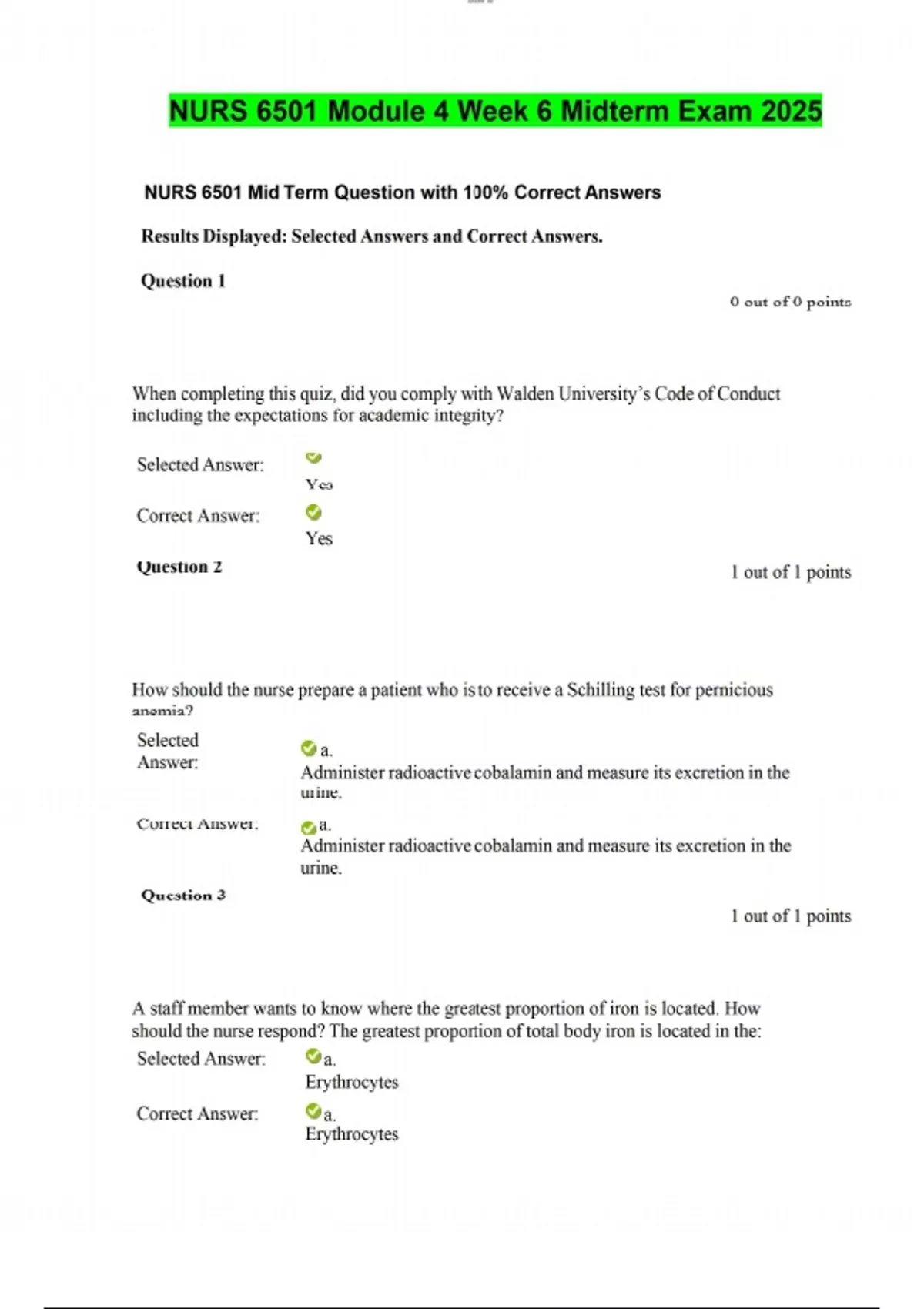 NURS 6501 Mid Term Question with 100% Correct Answers Results Displayed: Selected Answers and Correct Answers. Question 1 0 out of 0 points When completing this quiz, did you comply with Walden University’s Code of Conduct including the expectations for academic integrity? Selected Answer: Correct Answer: Question 2 Yes Yes 1 out of 1 points How should the nurse prepare a patient who is to receive a Schilling test for pernicious anemia? Selected Answer: a. Administer radioactive cobalamin and measure its excretion in the urine. Correct Answer: a. Administer radioactive cobalamin and measure its excretion in the urine. Question 3 1 out of 1 points A staff member wants to know where the greatest proportion of iron is located. How should the nurse respond? The greatest proportion of total body iron is located in the: Selected Answer: a. Erythrocytes Correct Answer: a. Erythrocytes lOMoAR cPSD| Question 4 1 out of 1 points A 21-year-old female was recently diagnosed with iron deficiency anemia. In addition to fatigue and weakness, which of the following clinical signs and symptoms would she most likely exhibit? Selected Answer: b. Spoon-shaped nails Correct Answer: b. Spoon-shaped nails Question 5 1 out of 1 points The people from which country have the lowest risk for Hodgkin lymphoma? Selected Answer: b. Japan Correct Answer: b. Japan Question 6 1 out of 1 points During an infection, the nurse assesses the lymph nodes. Lymph nodes enlarge and become tender because: Selected Answer: a. Lymphocytes are rapidly dividing. Correct Answer: a. Lymphocytes are rapidly dividing. Question 7 1 out of 1 points A nurse monitors for the most common childhood cancer, which is: Selected Answer: a. Acute lymphoblastic leukemia (ALL) lOMoAR cPSD| Correct Answer: a. Acute lymphoblastic leukemia (ALL) Question 8 1 out of 1 points A 35-year-old female is diagnosed with vitamin B12 deficiency anemia (pernicious anemia). How should the nurse respond when the patient asks what causes pernicious anemia? A decrease in is the most likely cause. Selected Answer: c. Intrinsic factor Correct Answer: c. Intrinsic factor Question 9 1 out of 1 points The nurse will check which of the following tests to directly measure iron stores? Selected Answer: c. Bone marrow biopsy Correct Answer: c. Bone marrow biopsy Question 10 1 out of 1 points When a nurse is reviewing lab results and notices that the erythrocytes contain an abnormally low concentration of hemoglobin, the nurse calls these erythrocytes: Selected Answer: b. Hypochromic Correct Answer: b. Hypochromic Question 11 1 out of 1 points A 65-year-old male experienced loss of appetite, weight loss, lemon-yellow skin, liver lOMoAR cPSD| enlargement, and a beefy red tongue shortly before his death. Autopsy suggested pernicious anemia, and the cause of death would most likely reveal: Selected Answer: c. Heart failure Correct Answer: c. Heart failure Question 12 1 out of 1 points A 5-year-old male was diagnosed with normocytic-normochromic anemia. Which of the following anemias does the nurse suspect the patient has? Selected Answer: b. Hemolytic anemia Correct Answer: b. Hemolytic anemia Question 13 1 out of 1 points A 10-year-old male presents with abdominal swelling, night sweats, fever, and weight loss. He is diagnosed with Burkitt lymphoma. Upon obtaining the history, which of the following is the most likely cause? Selected Answer: d. Epstein-Barr virus (EBV) Correct Answer: d. Epstein-Barr virus (EBV) Question 14 1 out of 1 points A 62-year-old female tells her health care provider she has been experiencing regular night sweats that cause her to wake up drenched. She also remarks that she has been unintentionally losing weight. Physical exam reveals enlarged lymph nodes on her neck that do not appear to be painful. She should be screened for which of the following cancers? Selected Answer: b. Hodgkin lymphoma lOMoAR cPSD| Correct Answer: b. Hodgkin lymphoma Question 15 1 out of 1 points An adult patient’s blood sample is analyzed in a laboratory. Assuming a normal sample, which type of white blood cell accounts for the highest percentage? Selected Answer: a. Neutrophils Correct Answer: a. Neutrophils Question 16 1 out of 1 points A 52-year-old male IV drug user was diagnosed with hepatitis C 5 years ago. He is now experiencing impaired blood clotting. The nurse suspects a decrease in which of the following vitamins? Selected Answer: a. K Correct Answer: a. K Question 17 1 out of 1 points A newborn baby is diagnosed with a blood disorder in which her platelet count is low. Which of the following does the nurse suspect could be the reason? Selected Answer: c. Decreased thrombopoietin Correct Answer: c. Decreased thrombopoietin Question 18 1 out of 1 points lOMoAR cPSD| A 15-year-old male is diagnosed with infectious mononucleosis. When the patient asks how he got this disease, how should the nurse respond? The most likely cause is: Selected Answer: b. Epstein-Barr virus (EBV) Correct Answer: b. Epstein-Barr virus (EBV) Question 19 1 out of 1 points A 45-year-old female undergoes a splenectomy to remove a tumor. Which of the following assessment finding is most likely to occur following surgery? Selected Answer: a. Leukocytosis Correct Answer: a. Leukocytosis Question 20 1 out of 1 points After initial compensation, what hemodynamic change should the nurse monitor for in a patient who has a reduction in the number of circulating erythrocytes? Selected Answer: d. Hyperdynamic circulatory state Correct Answer: d. Hyperdynamic circulatory state Question 21 1 out of 1 points A 50-year-old female is diagnosed with primary thrombocythemia. A nurse would expect the blood smear to reveal platelets. Selected Answer: d. Overproduced Correct Answer: d. Overproduced Question 22 1 out of 1 points lOMoAR cPSD| A nurse is teaching the staff about platelets. Which information should the nurse include? In addition to playing a role in hemostasis, platelets have the ability to: Selecte