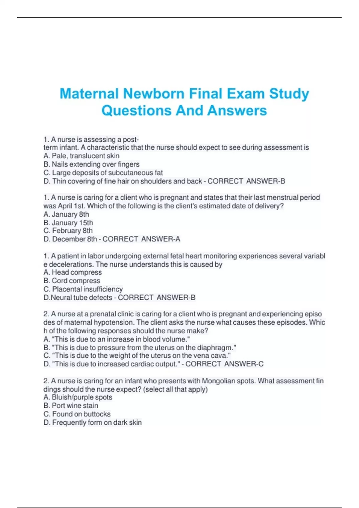 Maternal Newborn Final Exam Study Questions And Answers Maternal Newborn Final Exam Study Questions And Answers Maternal Newborn Final Exam Study Questions And Answers