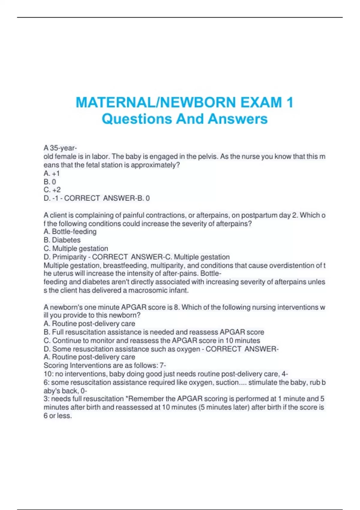 MATERNAL/NEWBORN EXAM 1 Questions And Answers MATERNAL/NEWBORN EXAM 1 Questions And Answers MATERNAL/NEWBORN EXAM 1 Questions And Answers