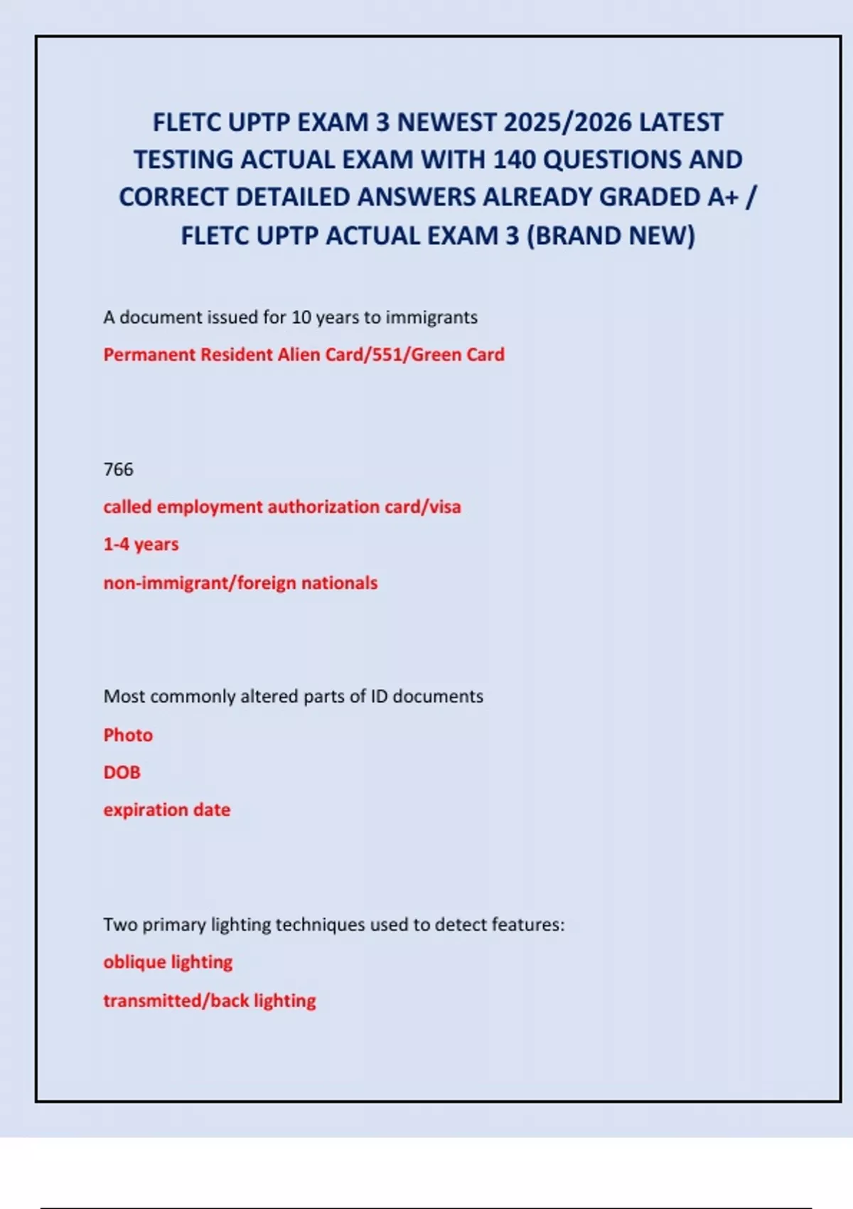 FLETC UPTP EXAM 3 NEWEST 2025/2026 LATEST TESTING ACTUAL EXAM WITH 140 QUESTIONS AND CORRECT DETAILED ANSWERS ALREADY GRADED A+ / FLETC UPTP ACTUAL EXAM 3 (BRAND NEW)
