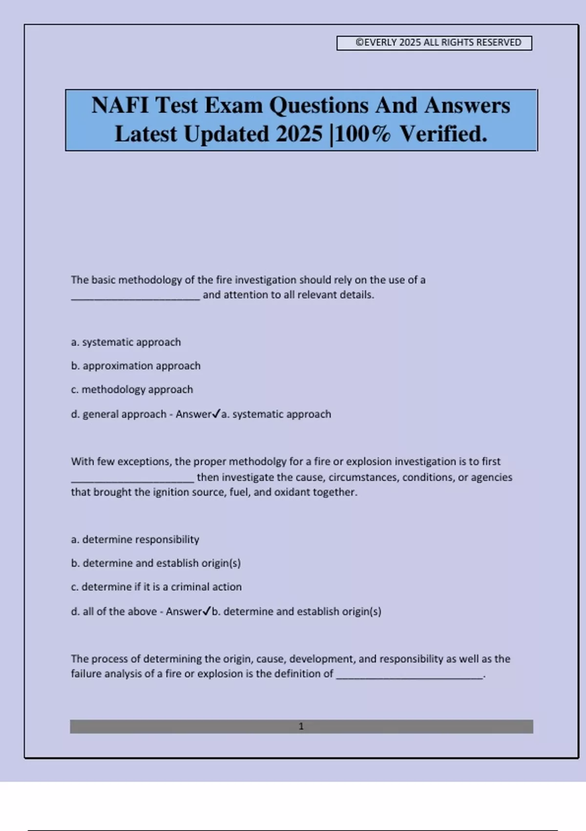 ©EVERLY 2025 ALL RIGHTS RESERVED 1 NAFI Test Exam Questions And Answers Latest Updated 2025 |100% Verified. The basic methodology of the fire investigation should rely on the use of a ______________________ and attention to all relevant details. a. systematic approach b. approximation approach c. methodology approach d. general approach - Answera. systematic approach With few exceptions, the proper methodolgy for a fire or explosion investigation is to first _____________________ then investigate the cause, circumstances, conditions, or agencies that brought the ignition source, fuel, and oxidant together. a. determine responsibility b. determine and establish origin(s) c. determine if it is a criminal action d. all of the above - Answerb. determine and establish origin(s) The process of determining the origin, cause, development, and responsibility as well as the failure analysis of a fire or explosion is the definition of _________________________. ©EVERLY 2025 ALL RIGHTS RESERVED 2 a. fire investigation b. fire scene reconstruction c. fire evaluation d. fire analysis - Answerd. fire analysis The process of determining the origin, cause, and responsibility for a fire or explosion is ___________________________. a. fire analysis b. fire investigation c. fire scene survey d. fire evaluation - Answerb. fire investigation The _____________________ is the systematic pursite of knowledge involving the recognition and formulation of a problem, the collection of data through observation and experiment, and the formulation and testing of a hypothesis. a. scientific method b. scientific examination c. scientific survey d. scientific theory - Answera. scientific method ____________________ are the visible or measurable physical effects that remain after a fire. These include thermal effects on materials, such as charring, oxidation, consumption of combustibles, smoke and soot deposits, distortion, melting, color changes, changes in character of materials, structural collapse, and other effects. a. Fire arrows b. Fire pointers ©EVERLY 2025 ALL RIGHTS RESERVED 3 c. Fire patterns d. Flammable patterns - Answerc. Fire patterns Distortion, breakage, deterioration, or other fault in an item, component, system, assembly, or structure that results in unsatisfactory performance of the function for which it was designed is called ________________. a. broken b. distorted c. failure d. faulty - Answerc. failure Vehicle fire inspections may present many other situations that pose safety hazards to the investigator. These can include: a. fuel leaks b. expelled lubricants c. electrical energy stored in the battery d. all of the above - Answerd. all of the above The burn or damage patterns remaining on the body panels and in the interior of the vehicle are primarily used to locate the ______________________. a. origin of the fire b. potential ignition sources c. fuel loads d. all of the above - Answerd. all of the above