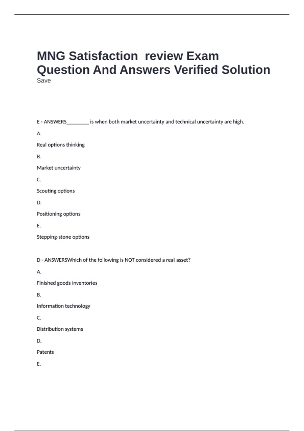 MNG Satisfaction review Exam Question And Answers Verified Solution Save