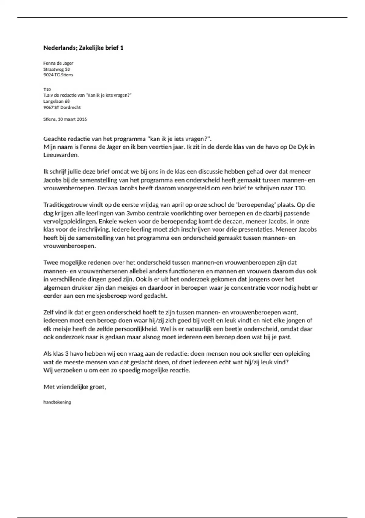 Nederlands; Zakelijke brief 1