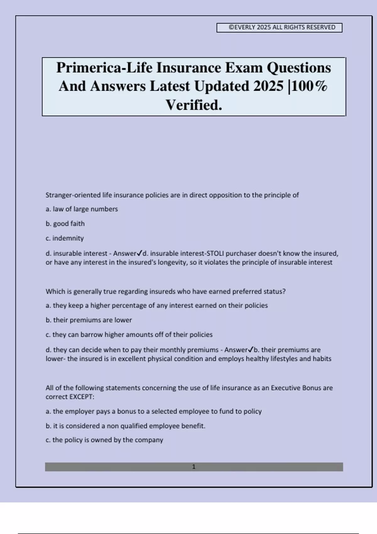 ©EVERLY 2025 ALL RIGHTS RESERVED 1 Primerica-Life Insurance Exam Questions And Answers Latest Updated 2025 |100% Verified. Stranger-oriented life insurance policies are in direct opposition to the principle of a. law of large numbers b. good faith c. indemnity d. insurable interest - Answerd. insurable interest-STOLI purchaser doesn't know the insured, or have any interest in the insured's longevity, so it violates the principle of insurable interest Which is generally true regarding insureds who have earned preferred status? a. they keep a higher percentage of any interest earned on their policies b. their premiums are lower c. they can barrow higher amounts off of their policies d. they can decide when to pay their monthly premiums - Answerb. their premiums are lower- the insured is in excellent physical condition and employs healthy lifestyles and habits All of the following statements concerning the use of life insurance as an Executive Bonus are correct EXCEPT: a. the employer pays a bonus to a selected employee to fund to policy b. it is considered a non qualified employee benefit. c. the policy is owned by the company ©EVERLY 2025 ALL RIGHTS RESERVED 2 d. any type of insurance policy may be used. - Answerc. the policy is owned by the company. An insured receives a monthly summary for his life insurance policy. He notices that the cash value of the policy is significantly lower this month than it was last month. What type of policy does the insured have? a. variable b. term c. securities d. stock - Answera. variable- life policies vary in value, as the name suggests, because the value is based on the stocks that support the policy. If a policyholder wants a more stable, reliable value, he/she should invest in a fixed policy. When an employer offers to give an employee a wage increase in the amount of the premium on a new life insurance policy, this is called a. aleatory contract b. executive bonus c. key person d. a fraternal association - Answerb. executive bonus In terms of Social Security, what is the interval spanning between the day when the youngest child of a family turns 16 and before the surviving spouse may receive retirement benefits? - AnswerBlackout period- begins when the youngest child reaches the age of 16, and ends when the surviving spouse qualifies for retirement benefits, as early as age 60. No benefits are paid during this time. Life insurance may be used to pay state inheritance taxes and federal estate taxes so that it is not necessary to sell off assets from the estate to pay these costs. This is called a. estate conservation b. estate creation c. survivor protection