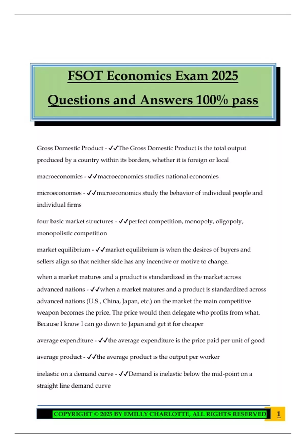 FSOT Economics Exam 2025 Questions and Answers 100% pass Gross Domestic Product - The Gross Domestic Product is the total output produced by a country within its borders, whether it is foreign or local macroeconomics - macroeconomics studies national economies microeconomies - microeconomics study the behavior of individual people and individual firms four basic market structures - perfect competition, monopoly, oligopoly, monopolistic competition market equilibrium - market equilibrium is when the desires of buyers and sellers align so that neither side has any incentive or motive to change. when a market matures and a product is standardized in the market across advanced nations - when a market matures and a product is standardized across advanced nations (U.S., China, Japan, etc.) on the market the main competitive weapon becomes the price. The price would then delegate who profits from what. Because I know I can go down to Japan and get it for cheaper average expenditure - the average expenditure is the price paid per unit of good average product - the average product is the output per worker inelastic on a demand curve - Demand is inelastic below the mid-point on a straight line demand curve