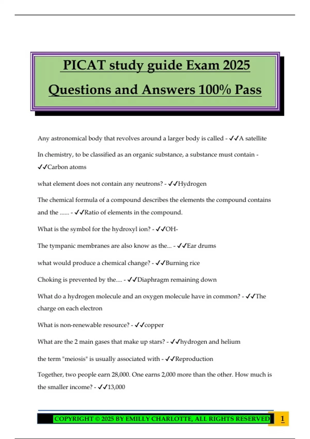 PICAT study guide Exam 2025 Questions and Answers 100% Pass Any astronomical body that revolves around a larger body is called - A satellite In chemistry, to be classified as an organic substance, a substance must contain - Carbon atoms what element does not contain any neutrons? - Hydrogen The chemical formula of a compound describes the elements the compound contains and the ...... - Ratio of elements in the compound. What is the symbol for the hydroxyl ion? - OH- The tympanic membranes are also know as the... - Ear drums what would produce a chemical change? - Burning rice Choking is prevented by the.... - Diaphragm remaining down What do a hydrogen molecule and an oxygen molecule have in common? - The charge on each electron What is non-renewable resource? - copper What are the 2 main gases that make up stars? - hydrogen and helium the term "meiosis" is usually associated with - Reproduction Together, two people earn 28,000. One earns 2,000 more than the other. How much is the smaller income? - 13,000 2COPYRIGHT © 2025 BY EMILLY CHARLOTTE, ALL RIGHTS RESERVED Jerry walked a dog from 6:40am to 7:30pm one day. If he was paid at the rate of 6$ per hour, how much did he earn that day? - $5.00 A women is looking for a bigger square office. She finds an office twice the area of her current office. If the perimeter of her current office is 88 feet, how many square feet is the new office? - 176 sq ft How many feet of a chain fence are necessary to enclose a dog pen that is square and has an area of 64 square feet? - 32 A train goes twice as fast downhill as it can go uphill, and 2/3 as fast uphill as it can go on level ground. If it goes 120 mph downhill, how long will it take to travel 45 miles on flat land? - 1 1/2 hours The pet store had six puppies selling for 104 each and twelve kittens selling for 24 each. Today, only two puppies and eight kittens were left. In dollar terms, what was the ratio of sales of puppies to kittens? - 13 to 3 Jamie just bought two boxes. The first box is square, with each side measuring 10 units, and is 4 units high. The second box is rectangular and has twice the volume of the square box. If the height of the second box is 5 units, and the width is 10 units, what is the length of the second box? - 16 units The price of salmon at a fish market is 5.40 per pound. This is 150% its cost at a supermarket. How much would it cost per pound at the supermarket? - $3.20 Before being painted, a concrete play area was marked off into squares and then into triangles. For the square shown, what is the area of the triangular part labeled XYZ? - 32 sq ft If the population of a certain city increased 25% in two years, the new population was what percent of the old? - 125% We will long remember our perilous journey - hazardous Inept most nearly means - Dull 3COPYRIGHT © 2025 BY EMILLY CHARLOTTE, ALL RIGHTS RESERVED Oppressive most nearly means - tyrannical Fervently most nearly means - passionately Devout most nearly means - Loose Adage most nearly means - Farewell Embody most nearly means - to exemplify Erratically most nearly means - irregularly Peruse most nearly means - to study Riding the mail plane is a low-budget way to visit America's largest national park Wrangle Street Elias 13 million Acres of Scenic Beauty. Copper first Drew Prospectors to this part of Alaska. From 1911 to 1938, the kinetic mine produced 200 million tons of it now a mec