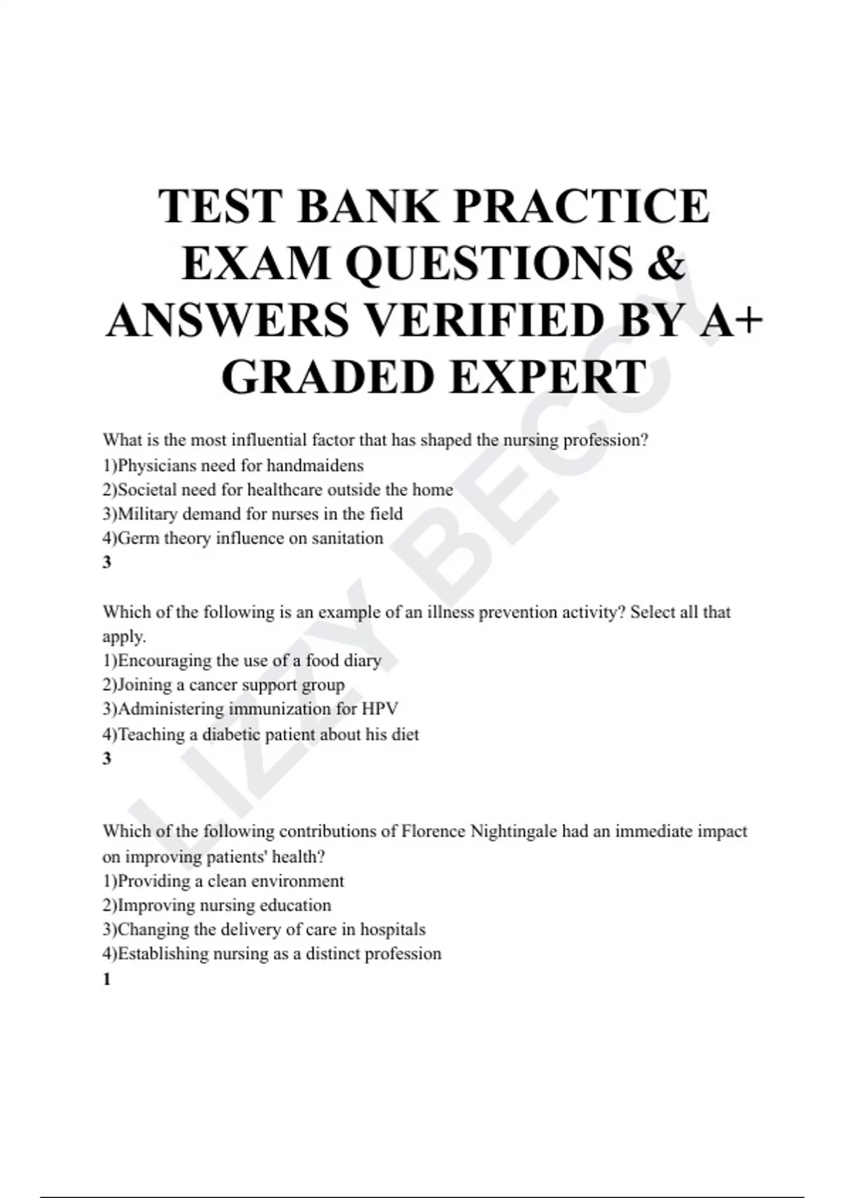 What is the most influential factor that has shaped the nursing profession? 1)Physicians need for handmaidens 2)Societal need for healthcare outside the home 3)Military demand for nurses in the field 4)Germ theory influence on sanitation 3 Which of the following is an example of an illness prevention activity? Select all that apply. 1)Encouraging the use of a food diary 2)Joining a cancer support group 3)Administering immunization for HPV 4)Teaching a diabetic patient about his diet 3 Which of the following contributions of Florence Nightingale had an immediate impact on improving patients' health? 1)Providing a clean environment 2)Improving nursing education 3)Changing the delivery of care in hospitals 4)Establishing nursing as a distinct profession 1