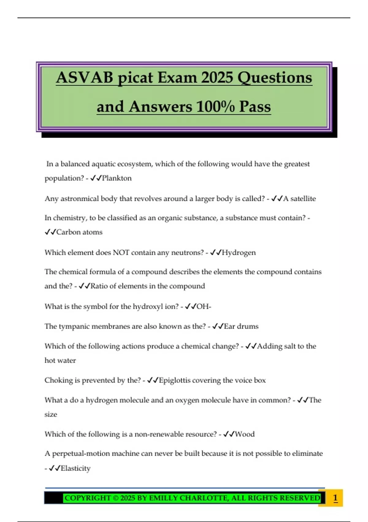 ASVAB picat Exam 2025 Questions and Answers 100% Pass In a balanced aquatic ecosystem, which of the following would have the greatest population? - Plankton Any astronmical body that revolves around a larger body is called? - A satellite In chemistry, to be classified as an organic substance, a substance must contain? - Carbon atoms Which element does NOT contain any neutrons? - Hydrogen The chemical formula of a compound describes the elements the compound contains and the? - Ratio of elements in the compound What is the symbol for the hydroxyl ion? - OH- The tympanic membranes are also known as the? - Ear drums Which of the following actions produce a chemical change? - Adding salt to the hot water Choking is prevented by the? - Epiglottis covering the voice box What a do a hydrogen molecule and an oxygen molecule have in common? - The size Which of the following is a non-renewable resource? - Wood A perpetual-motion machine can never be built because it is not possible to eliminate - Elasticity 2COPYRIGHT © 2025 BY EMILLY CHARLOTTE, ALL RIGHTS RESERVED Which of the following is a renewable resource? - Peanut Oil When scientists measure a liquids resistance to flow, they are measuring the liquid's? - Viscosity A student bought a sandwich for 80 cents, milk for 20 cents, and pie for 30 cents. How much did the meal cost? - $1.30 Together, two people earn $28,000. One earns $2,000 more than the other. How much is the smallest income? - $13,000 Jerry walked a dog from 6:40 am to 7:30 pm one day. If he was paid at the rate of 6$ per hour, how much did he earn that day? - $5.00 A woman is looking for a bigger square office. She finds an office twice the area of her current office. If the perimeter of her current office is 88 feet, how many square feet is the new office? - 968 sq feet How many feet of chain fence are necessary to enclose a dog pen that is square and has an area of 64 sq feet? - 32 A train goes twice as fast downhill as it can go uphill, and 2/3 feet as fast uphill as it can go on level ground. If it goes 120 miles per hour downhill, how long will it take to travel 45 miles per flat land? - 1/2 hour Each August, a resentment's rent is adjusted to the cost-of-living index. The rent has been $1,550 a month, and the cost of living index for this August was 3.796. What is the new rent per month? - $1,607.35 Shawn purchased a shirt for $22.05. If this includes. If this includes 5% sales tax, what was the actual price of the shirt? - $20.95 The pet store had six puppies selling for $104 each and twelve kittens selling for $104 each and twelve kittens selling for 24 each. Today only two puppies and eight kittens were left. in dollar terms, what was the ratio of sales puppies to kittens? - 13 to 3 3COPYRIGHT © 2025 BY EMILLY CHARLOTTE, ALL RIGHTS RESERVED There are 9 red and 6 green marbles in a bag. A child reaches in the bag and randomly takes one marble. What is the probability of that child getting a green marble? - .40 Jamie just bought two boxes. The first box is square, with each side measuring 10 units, and is 4 units high. The second box is rectangular and has twice the volume of the square box. If the height of the second box is 5 units, and the width is 10 units, what is the length of the second box? - 16 un