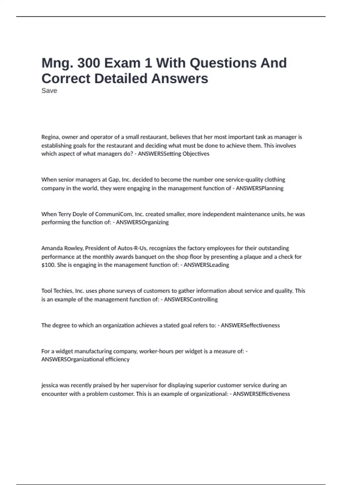 Mng. 300 Exam 1 With Questions And Correct Detailed Answers Save