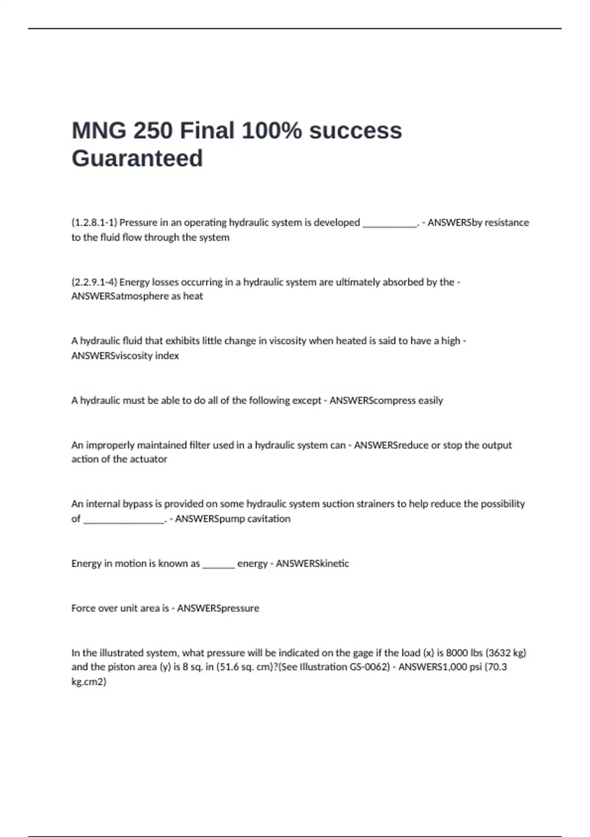 (1.2.8.1-1) Pressure in an operating hydraulic system is developed __________. - ANSWERSby resistance to the fluid flow through the system (2.2.9.1-4) Energy losses occurring in a hydraulic system are ultimately absorbed by the - ANSWERSatmosphere as heat A hydraulic fluid that exhibits little change in viscosity when heated is said to have a high - ANSWERSviscosity index A hydraulic must be able to do all of the following except - ANSWERScompress easily An improperly maintained filter used in a hydraulic system can - ANSWERSreduce or stop the output action of the actuator An internal bypass is provided on some hydraulic system suction strainers to help reduce the possibility of _______________. - ANSWERSpump cavitation Energy in motion is known as ______ energy - ANSWERSkinetic Force over unit area is - ANSWERSpressure In the illustrated system, what pressure will be indicated on the gage if the load (x) is 8000 lbs (3632 kg) and the piston area (y) is 8 sq. in (51.6 sq. cm)?(See Illustration GS-0062) - ANSWERS1,000 psi (70.3 2) In the illustrated system, what pressure will be indicated on the gage if the load (x) is 10,000 lbs (4540 kg) and the piston area (y) is 8 sq. in (51.6 sq. cm)?(See illustration GS-0062). - ANSWERS1,250 psi (87.88 kg/cm2) in the illustration which letter is the symbol for a filter?(GS-0068) - ANSWERSD in the illustration which letter is the symbol for a cooler? Gs-0068 - ANSWERSE In the system illustrated, which of the following readings should be indicated on the pressure gage, if the load (x) is 8000 lbs (3632 kg) and the piston area (y) is 10 sq. in (64.5 sq. cm) - ANSWERS800 psi (56.31 kg/cm2) Pascals law states that pressure exerted on a confined liquid - ANSWERSis distributed equally thoughout the liquid Some fluid filters used in hydraulic systems are designed to cope with increasing pressure differentials by ___________. - ANSWERSautomatically bypassing the fluid via an internal valve arrangement Strainers are commonly used in hydraulic systems to ___________ - ANSWERSprevent solid particles from entering the pump The component which is used to thoroughly separate small, fine, dust-like particulate contamination from hydraulic fluid is a/an - ANSWERSfilter The pressure of an operating hydraulic system, as indicated by a pressure gauge, is a result of the fluid flow overcoming ________________ - ANSWERSall of the above What Characteristics of a fluid does the term specific gravity describe - ANSWERSDensity Pressure in an operating hydraulic system is developed - ANSWERSby resistance to the fluid flow through the system Energy losses occurring in a hydraulic system are ultimately absorbed by the __________. - ANSWERSatmosphere as heat A casing drain is provided for axial piston and bent axis variable stroke pumps to - ANSWERSprevent damage due to agitation and overheating of oil accumulated in the casing as a result of minor internal leakage An axial piston pump differs from a radial piston pump as the pistons of an axial piston pump are positioned - ANSWERSparallel to each other and to the shaft Figure "D" in the illustration is an improperly installed hose with a restriction developed at the ________. (See illustration GS-0063) - ANSWERSsharp bend formed at the left If the flow rate to a linear actuator is reduced by half of the original amount, the __________. - ANSWERSspeed of the actuator will be reduced If the operator releases the handle of the illustrated device while the system output is in motion, the valve will __________.(GS-0032) - ANSWERSreturn to its centered position and the output speed will drop to zero Regarding the device shown in the illustration, if the operator releases the handle while the system output is in motion, the __________. (GS-0035) - ANSWERSvalve will remain in position with the output remaining unchanged The device illustrated is considered to be a pump. Which of the following statements is true if it is to be used as a hydraulic motor?(GS-0074) - ANSWERSSprings would have to be added to the back of the vanes The device shown in the illustration is known as a/an __________.(GS-0032) - ANSWERSspring centered directional control valve The discharge capacity of the axial piston hydraulic pump, shown in the illustration, is __________.(GS-0058) - ANSWERSfixed by the pump housing angle The portion of a hydraulic hose that determines its overall strength, is the - ANSWERSbraided inner layer(s The purpose of the crescent found in the illustrated internal gear pump is to ______. (See Illustration GS-0127) - ANSWERScause liquid to be trapped in between the gear spaces as the gear passes the crescent What type of pump is shown?(GS-0074) - ANSWERSvane pump What type of pump is shown.(GS-0102) - ANSWERSAxial piston pump When the tilting box of a variable stroke axial-piston pump is perpendicular to the pump shaft, which of the following conditions will exist? - ANSWERSThere is no fluid flow. Which of the statements is true concerning the illustrated hydraulic circuit when the directional control valve is centered? Illustration GS-0105 - ANSWERSThe load on the actuator may cause a difference in pressure to exist between the rod and cap end, and oil discharging to the sump across the relief valve with the pump operating Why is the discharge pressure of a herringbone gear pump steadier than the discharge pressure of a simple spur gear pump? - ANSWERSOne discharge phase begins before the previous discharge phase has been completed The figures shown in the illustration shows two different positions of the same steering gear hydraulic pump. Which of the following statements is correct? - ANSWERSChanging from position I to position II will always reverse the direction of fluid flow. Valve "D" indicated in the illustration is referred to as a/an __________. - ANSWERSunloading valve If the device shown in the illustration is used to control the output of a variable displacement pump, and part "A" is displaced 50% from "zero" stroke, which o