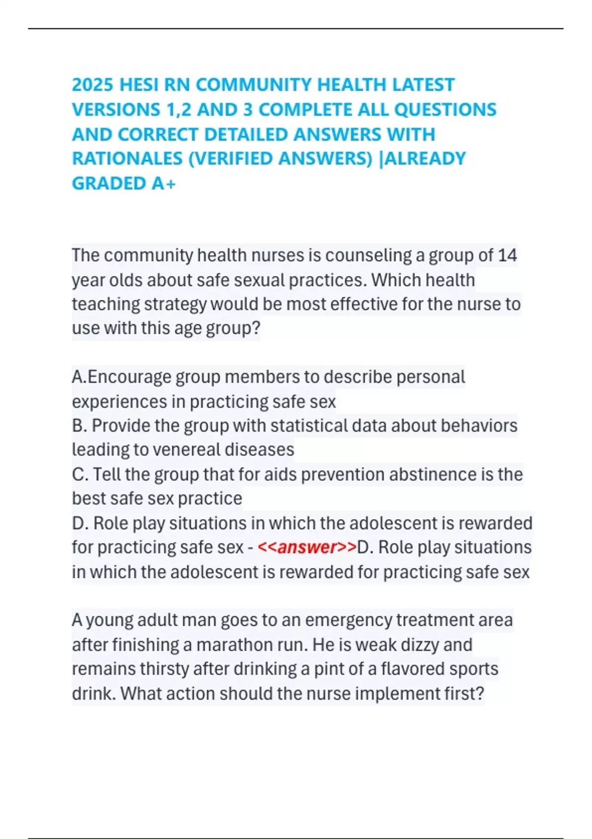 2025 HESI RN COMMUNITY HEALTH LATEST VERSIONS 1,2 AND 3 COMPLETE ALL QUESTIONS AND CORRECT DETAILED ANSWERS WITH RATIONALES (VERIFIED ANSWERS) |ALREADY GRADED A+ The community health nurses is counseling a group of 14 year olds about safe sexual prac