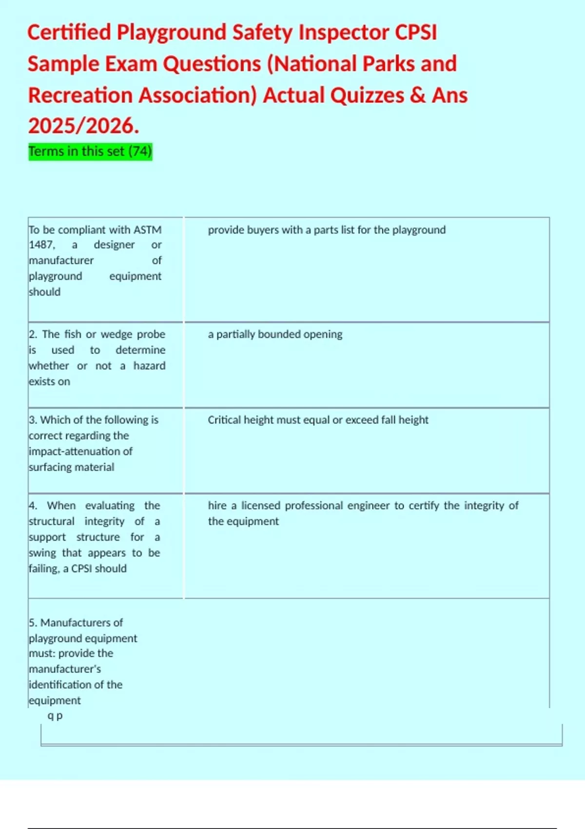 Certified Playground Safety Inspector CPSI Sample Exam Questions (National Parks and Recreation Association) Actual Quizzes & Ans 2025/2026.