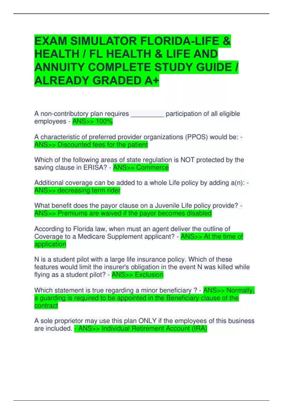 EXAM SIMULATOR FLORIDA-LIFE & HEALTH / FL HEALTH & LIFE AND ANNUITY COMPLETE STUDY GUIDE / ALREADY GRADED A+