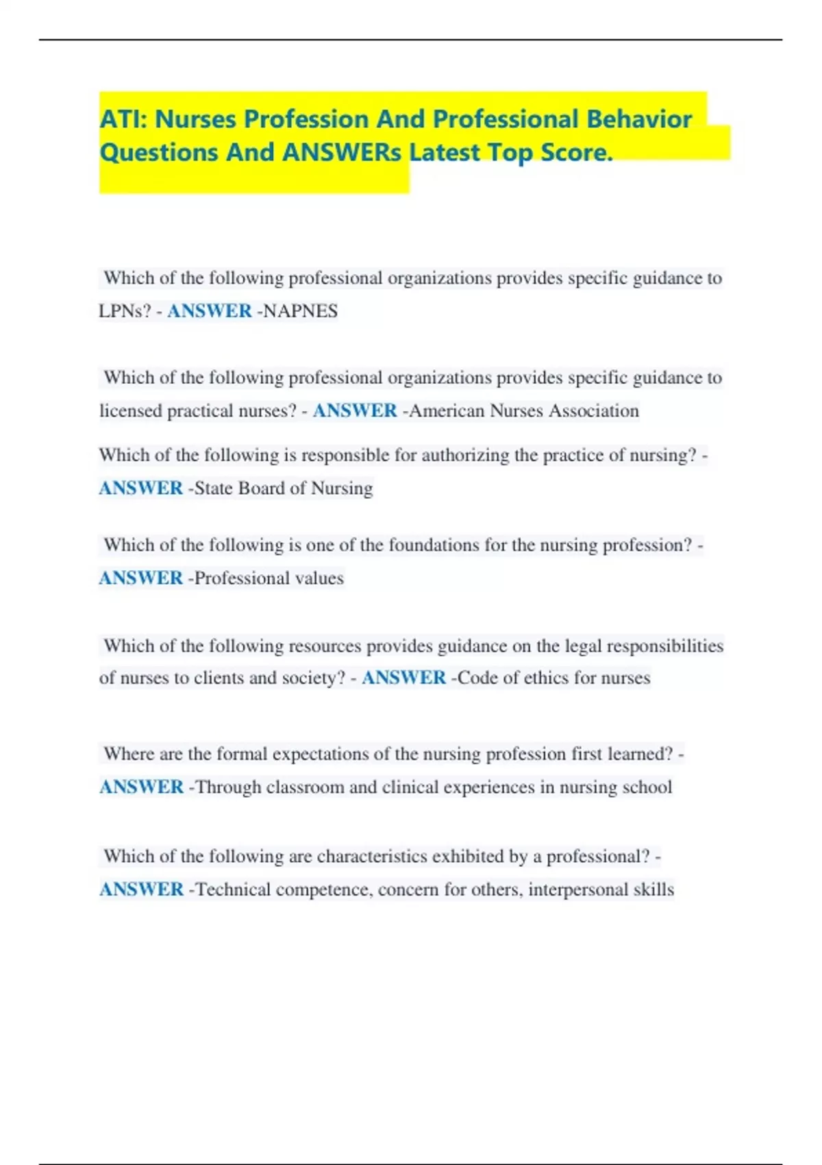 Which of the following professional organizations provides specific guidance to LPNs? - ANSWER -NAPNES Which of the following professional organizations provides specific guidance to licensed practical nurses? - ANSWER -American Nurses Association Which of the following is responsible for authorizing the practice of nursing? - ANSWER -State Board of Nursing Which of the following is one of the foundations for the nursing profession? - ANSWER -Professional values Which of the following resources provides guidance on the legal responsibilities of nurses to clients and society? - ANSWER -Code of ethics for nurses Where are the formal expectations of the nursing profession first learned? - ANSWER -Through classroom and clinical experiences in nursing school Which of the following are characteristics exhibited by a professional? - ANSWER -Technical competence, concern for others, interpersonal skills