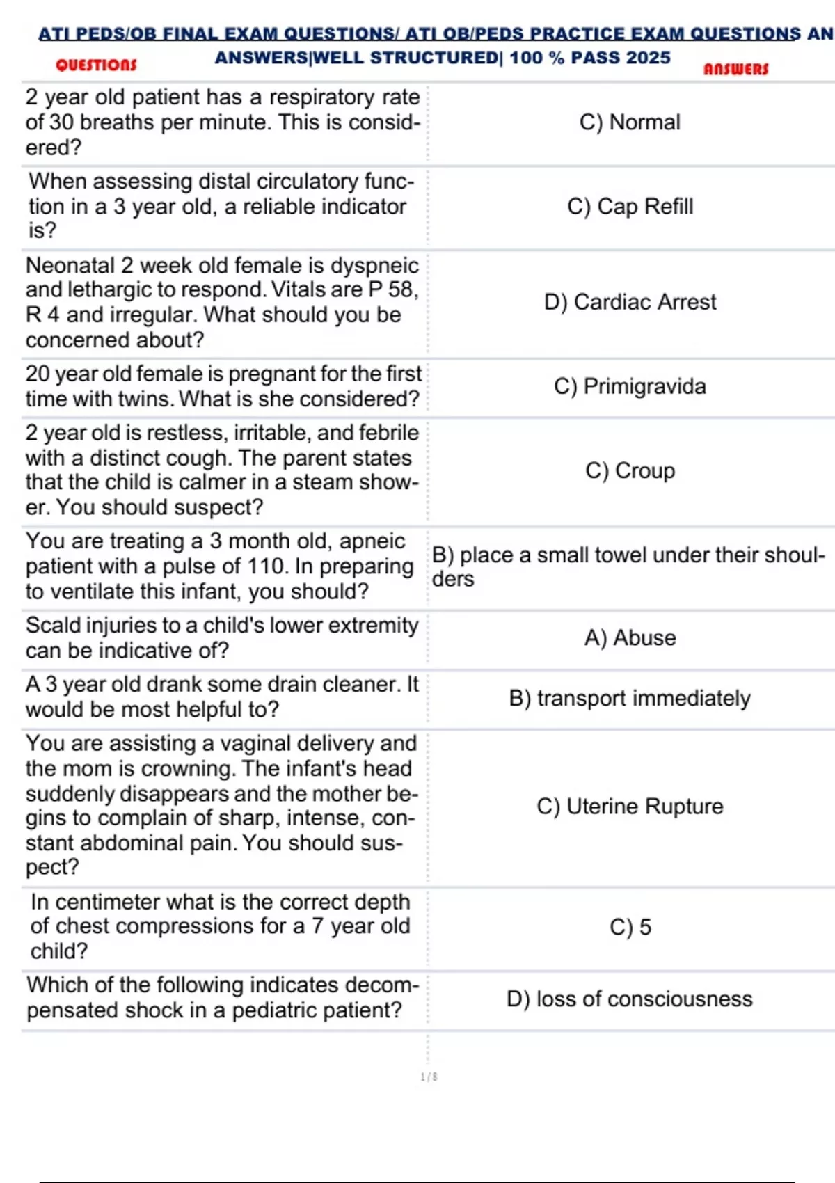 , ATI PEDS/OB FINAL EXAM QUESTIONS/ ATI OB/PEDS PRACTICE EXAM QUESTIONS AND