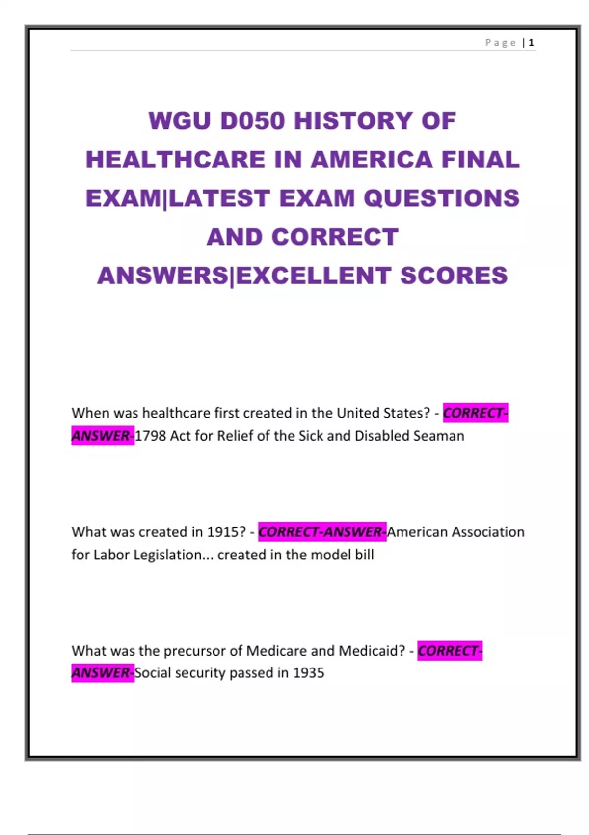 WGU D050 HISTORY OF HEALTHCARE IN AMERICA FINAL EXAM|LATEST EXAM QUESTIONS AND CORRECT ANSWERS|EXCELLENT SCORES