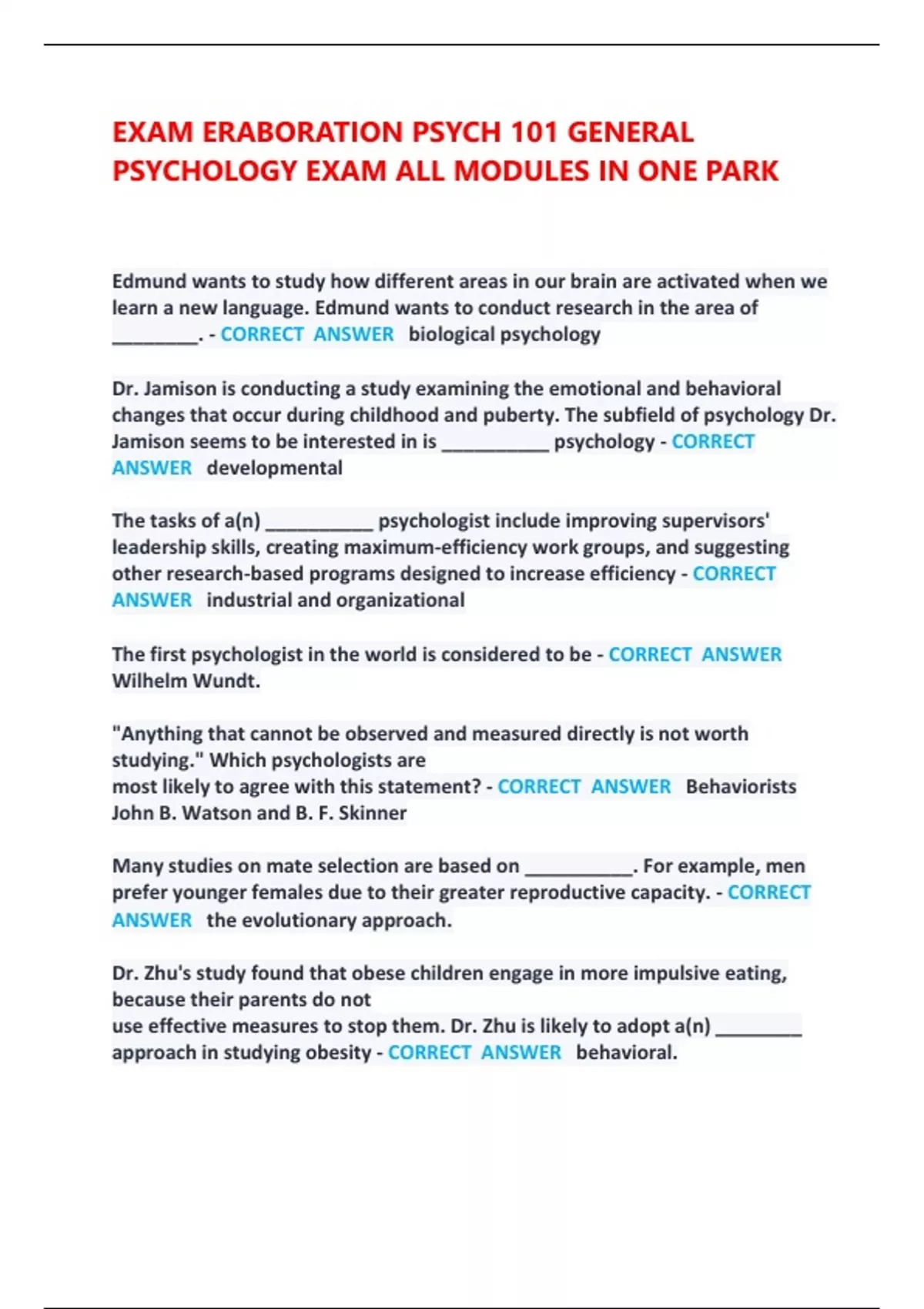 PSYCHOLOGY EXAM ALL MODULES IN ONE PARK